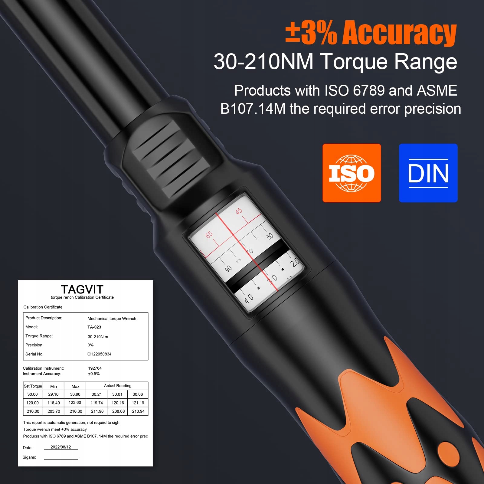 【±3% Wysoka dokładność】 Klucz dynamometryczny 1/2 cala ma zakres pomiarowy od 30 do 210 Nm, a skala jest wyraźna i łatwa do odczytania. Zakres błędu kalibracji wynosi ±3% i każdy klucz jest sprawdzany zgodnie z normą DIN EN ISO 6789-1:2017-07 z oficjalnym certyfikatem kalibracji. Bezpieczny i niezawodny.