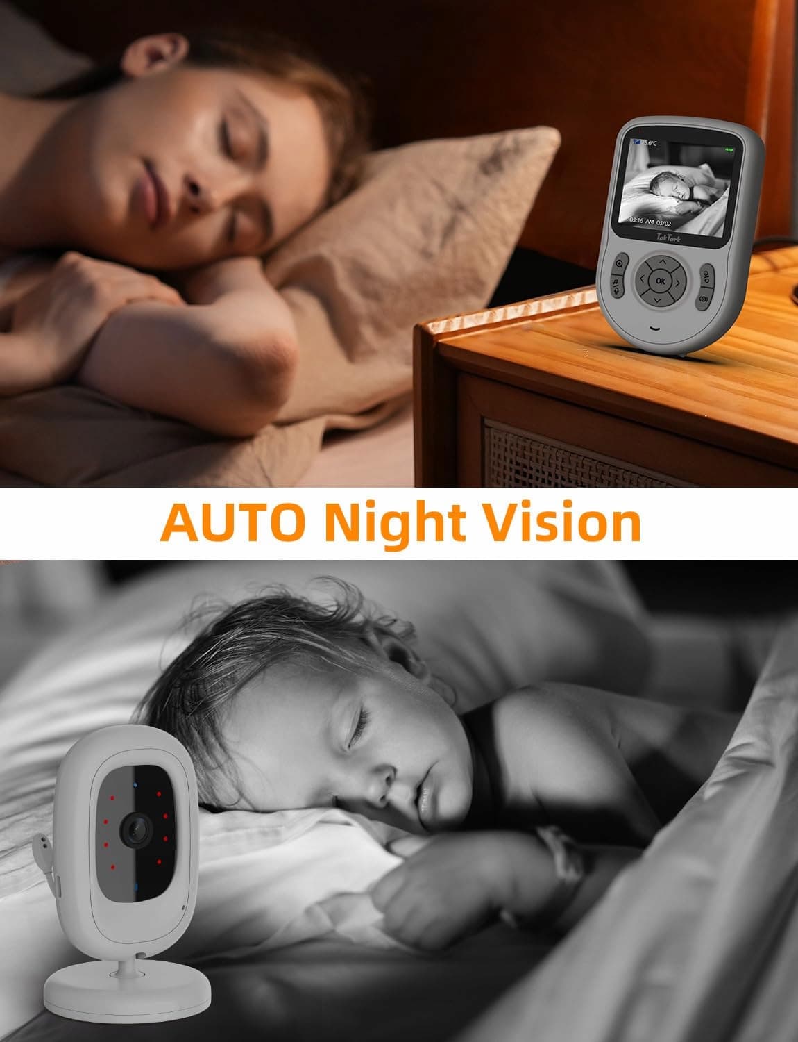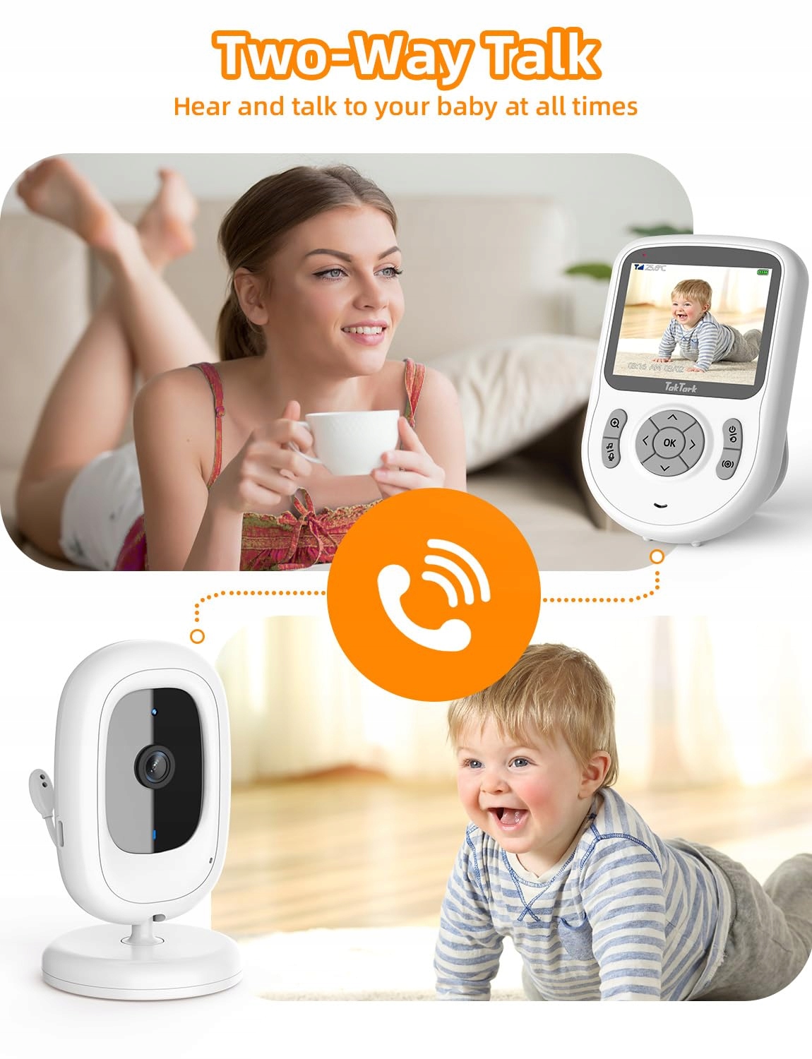 【Funkcja dwukierunkowej rozmowy】Dzięki czułemu mikrofonowi i głośnikowi wideo-niani z kamerą możesz rozmawiać z dzieckiem nawet z większej odległości. Technologia GFSK kamery redukuje możliwe zakłócenia dźwięku. Gdy dziecko płacze, możesz je uspokoić i uciszyć za pomocą funkcji dwukierunkowej rozmowy niani z kamerą