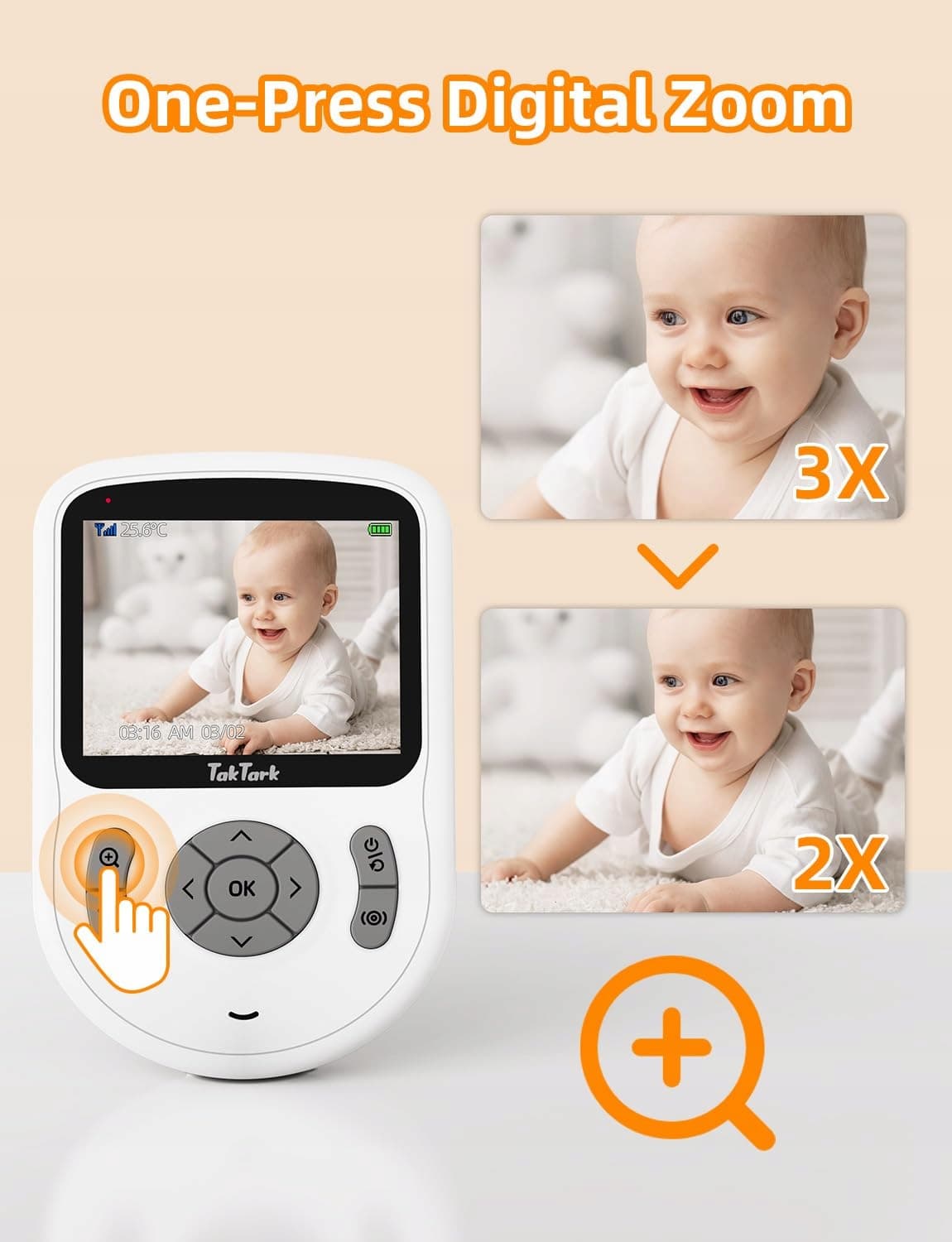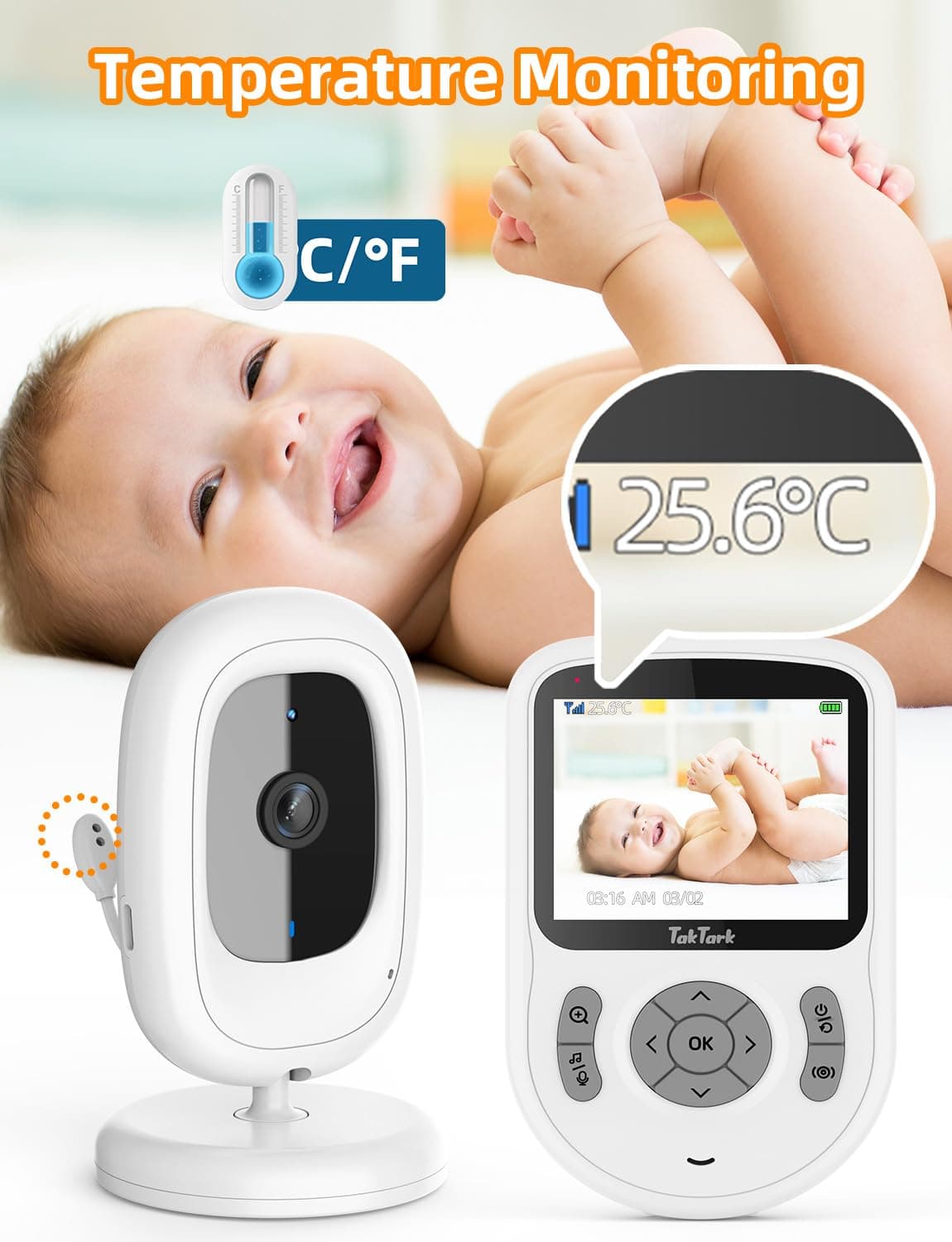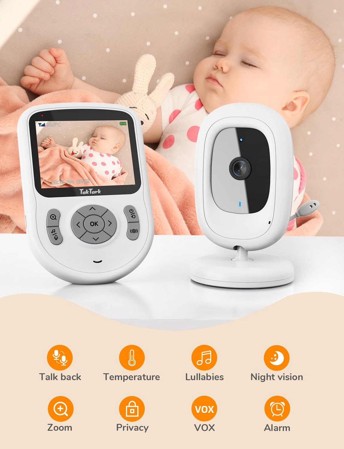 TakTark niania z kamerą [2,8 cala/720p IPS niania] Niania z kamerą bez Wi-Fi, zasięg do 1000 stóp, bateria 750mAh, dwukierunkowa rozmowa, VOX, 3× zoom, noktowizor, monitorowanie temperatury, kołysanki