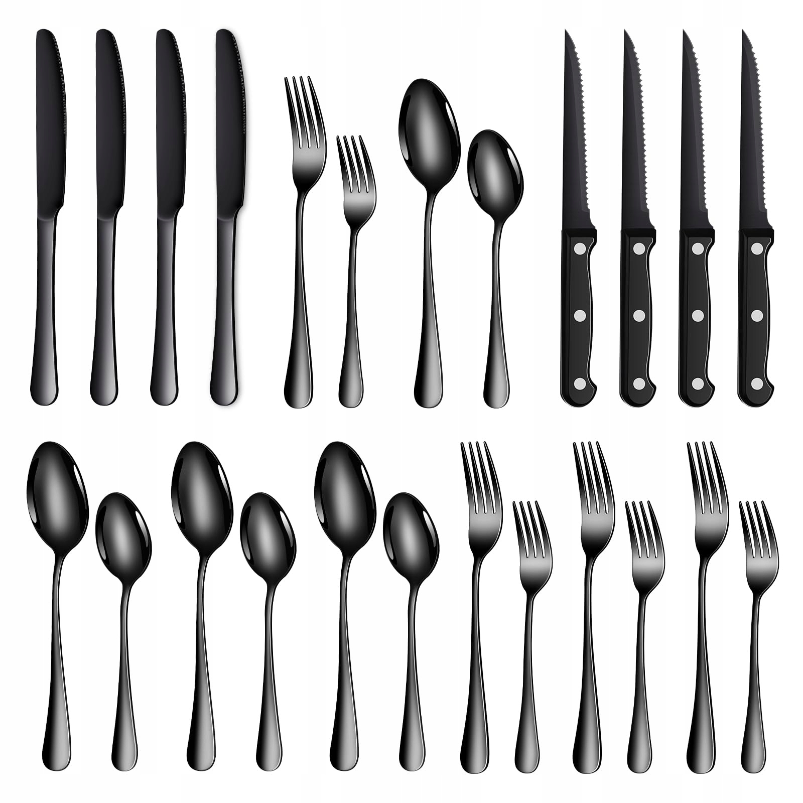 TAN REN Zestaw Sztućców Czarny 24 Sztuki Stal Nierdzewna dla 4 Osób