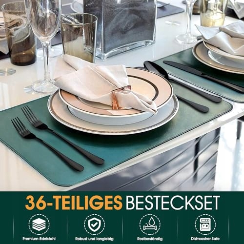 Zestaw sztućców TAN REN Czarny dla 6 osób, 36-częściowy zestaw sztućców ze stali nierdzewnej w kolorze czarnym z nożem do steków, eleganckie sztućce z nożem, widelcem i łyżką, sztućce stołowe do kuchni/restauracji
