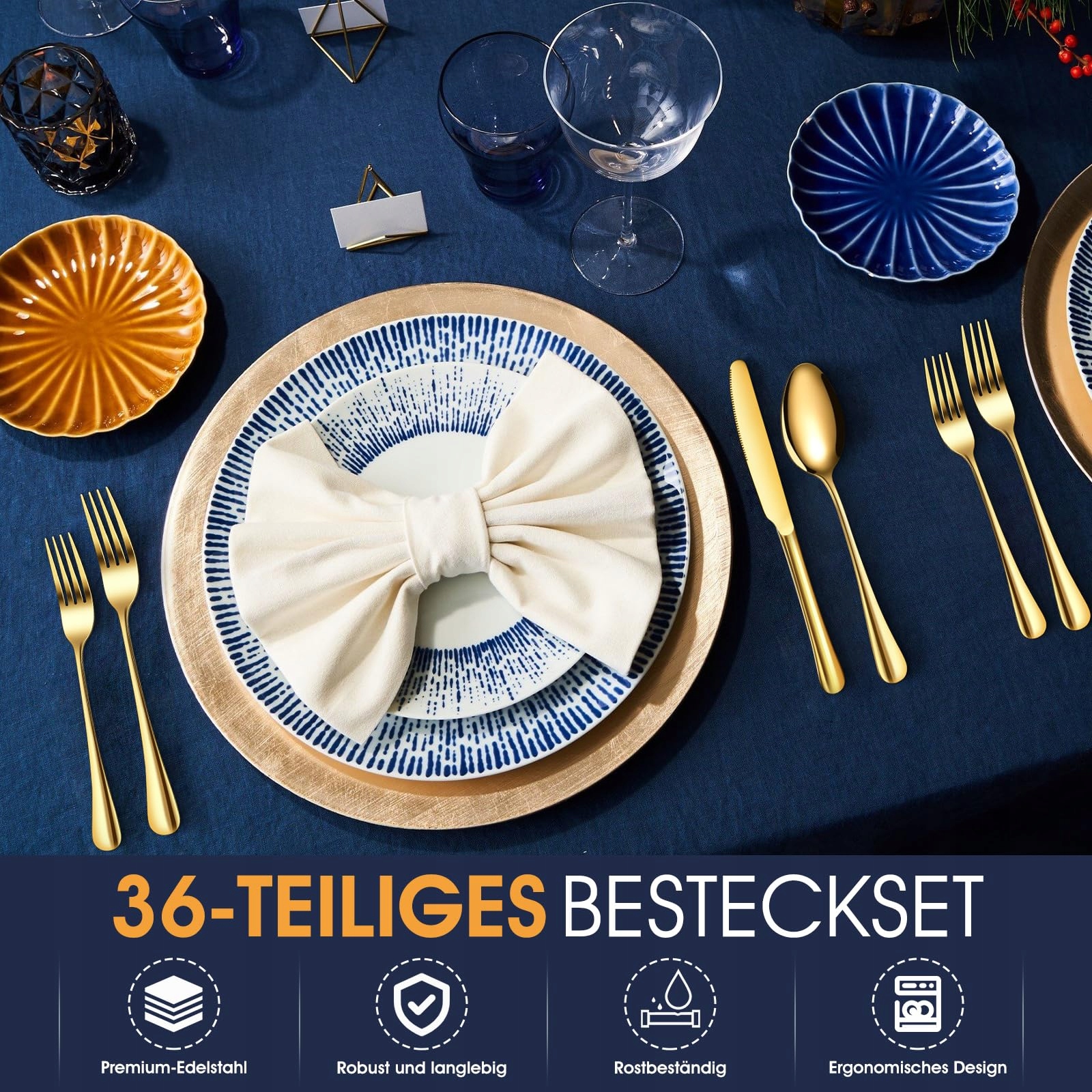 TAN REN Zestaw Sztućców Złoty 36 Części Stal Nierdzewna 6 Osób