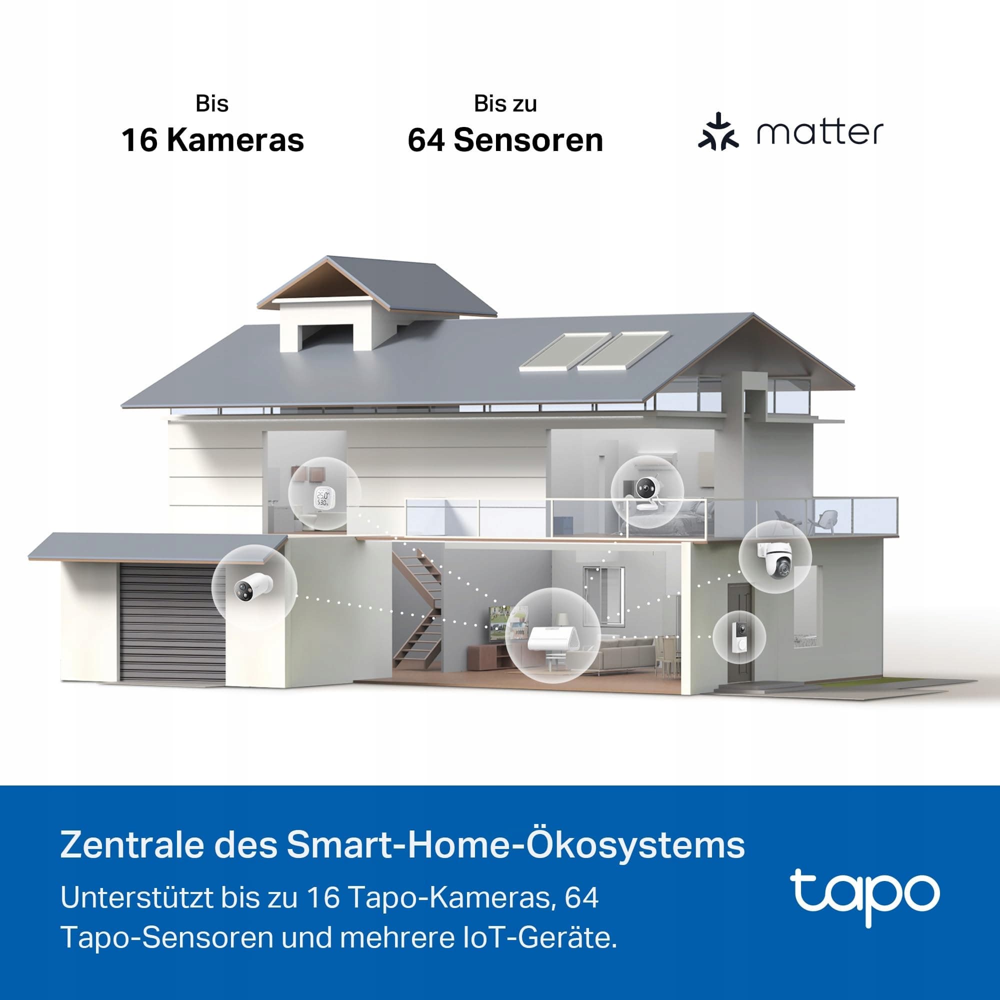 Centrum dla Twojego inteligentnego domu: Łączy do 16 kamer Tapo i 64 czujniki, tworząc bezproblemowy i bezpieczny ekosystem. Kompatybilne urządzenia znajdziesz na tp-link.com/de/support/faq/4191/