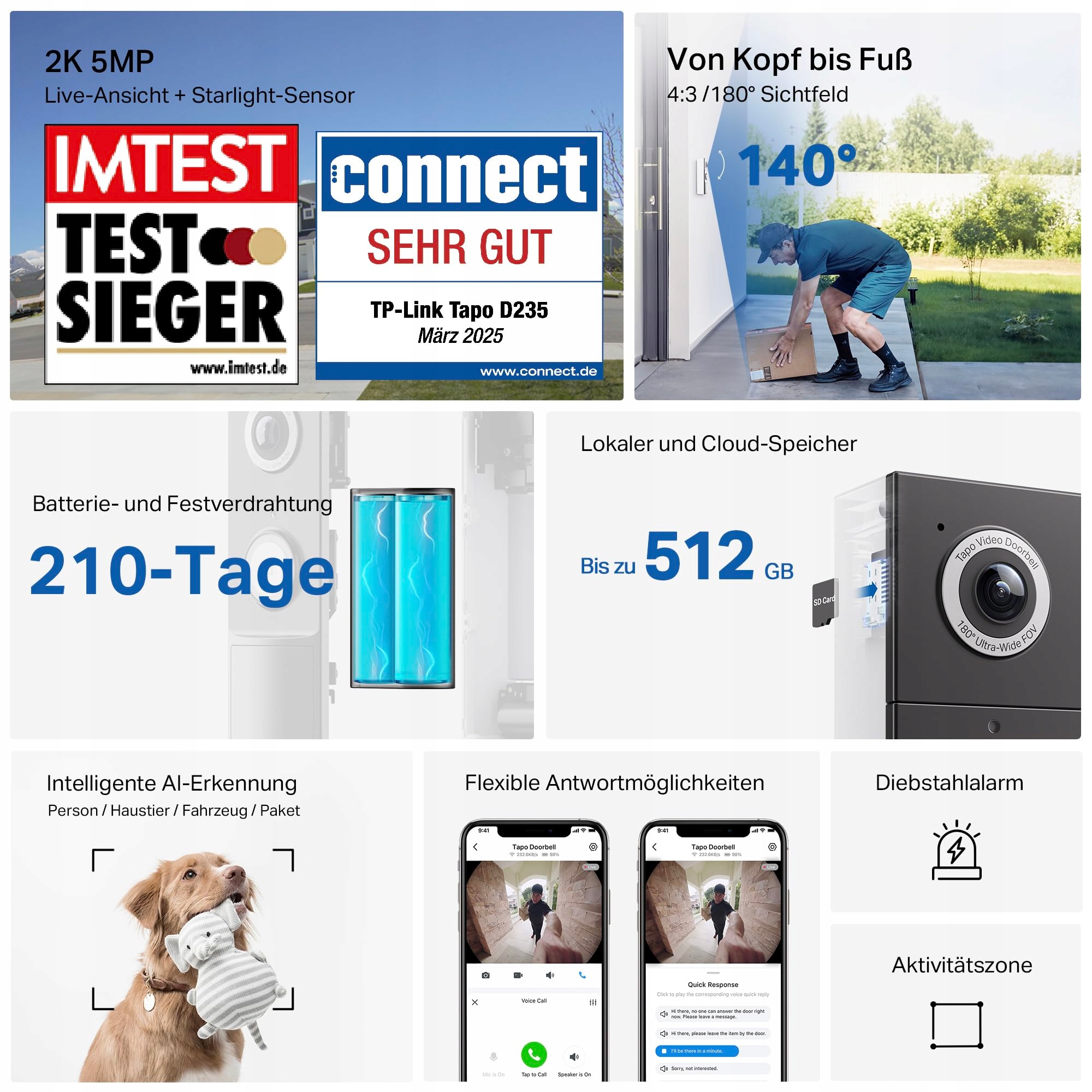 Tapo D235 Wideodomofon na baterię/przewodowy (Wideodomofon) | Dzwonek do drzwi z kamerą, 2K 5MP, kolorowy tryb nocny, 180° ultraszerokokątny widok, bateria 10000 mAh niewymienna, z dzwonkiem, Alexa