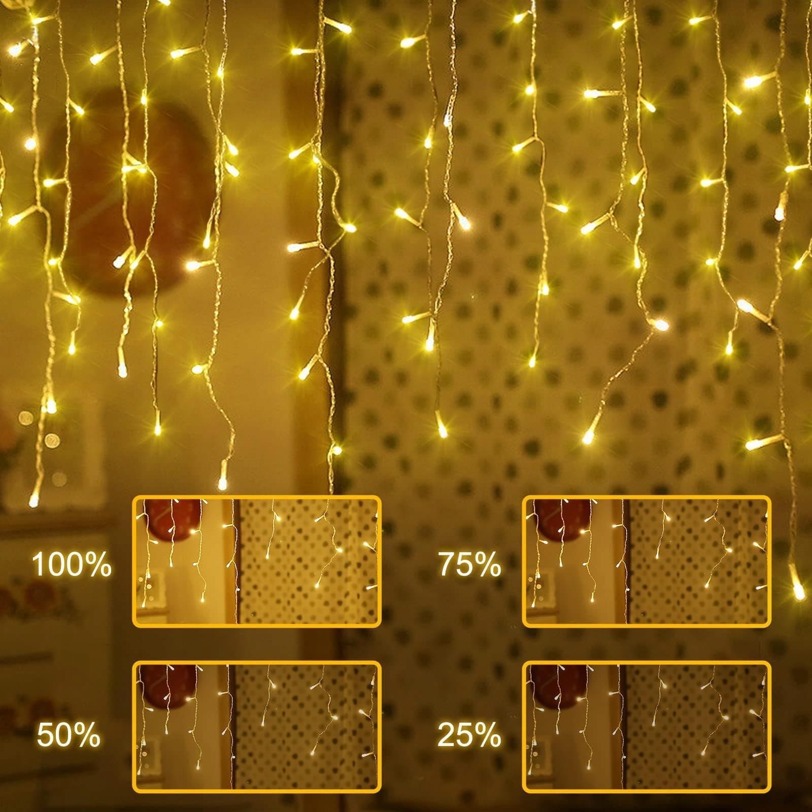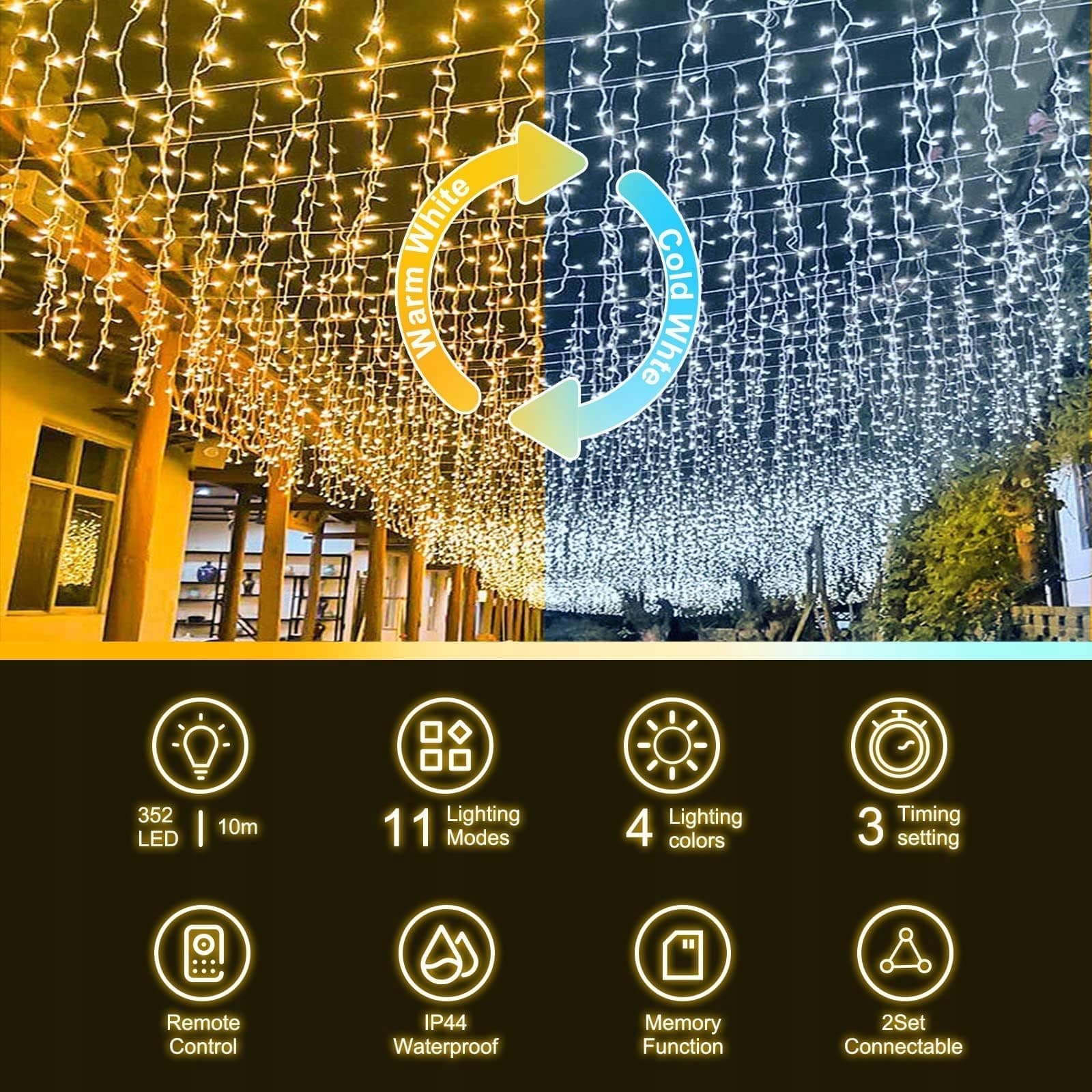 Światełka LED do użytku wewnętrznego i zewnętrznego, 352 LED 10 m 11 trybów, światełka na drucie miedzianym IP44 na imprezę, wesele, ogród, Boże Narodzenie, pokój, patio, zasłony z wtyczką i pilotem, 3 timery (10 m)