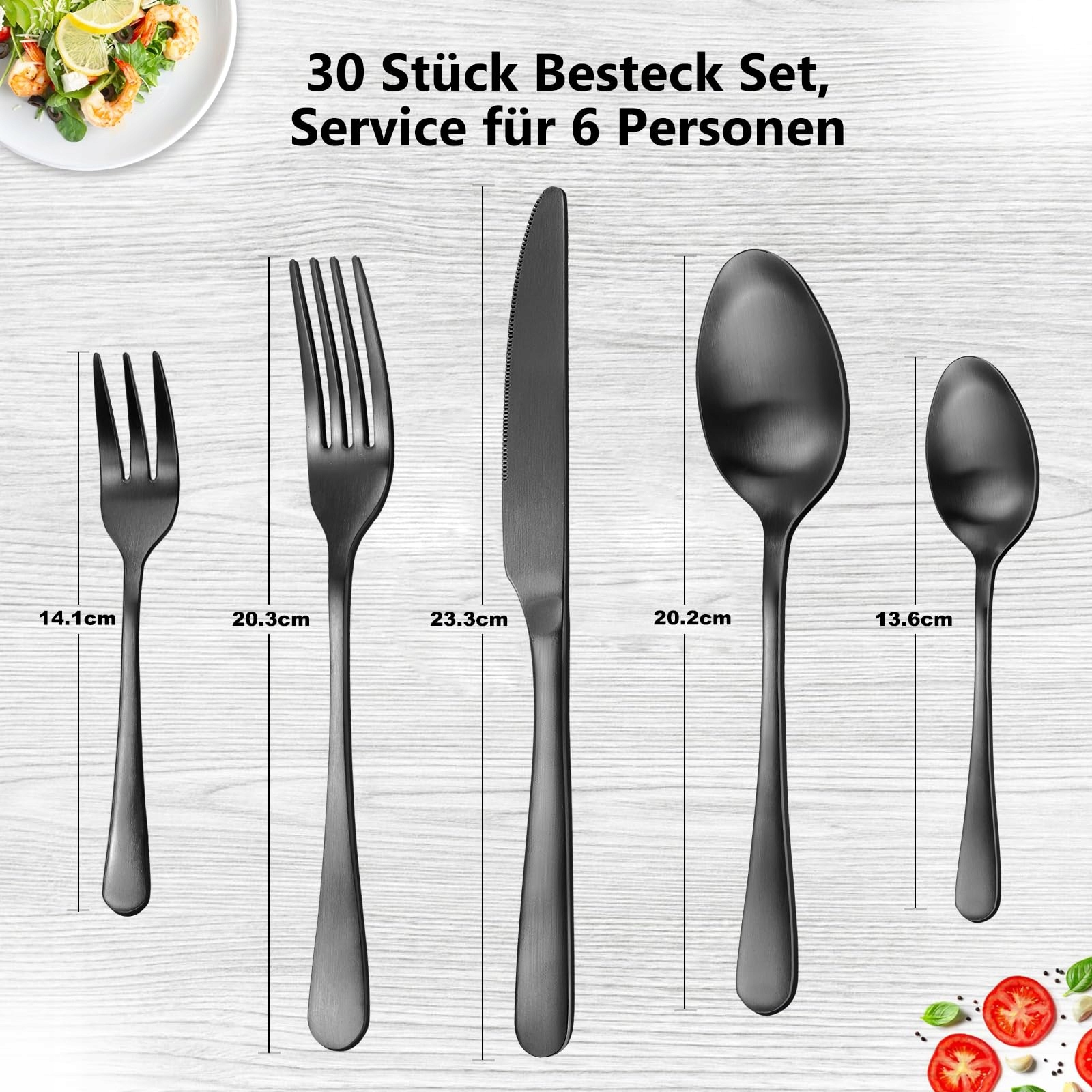 Zestaw sztućców Targzier dla 6 osób, 30 częściowy, czarny matowy zestaw sztućców, zestaw sztućców w tym noże, widelce, łyżki, czarne sztućce ze stali nierdzewnej, matowe i nadające się do zmywarki