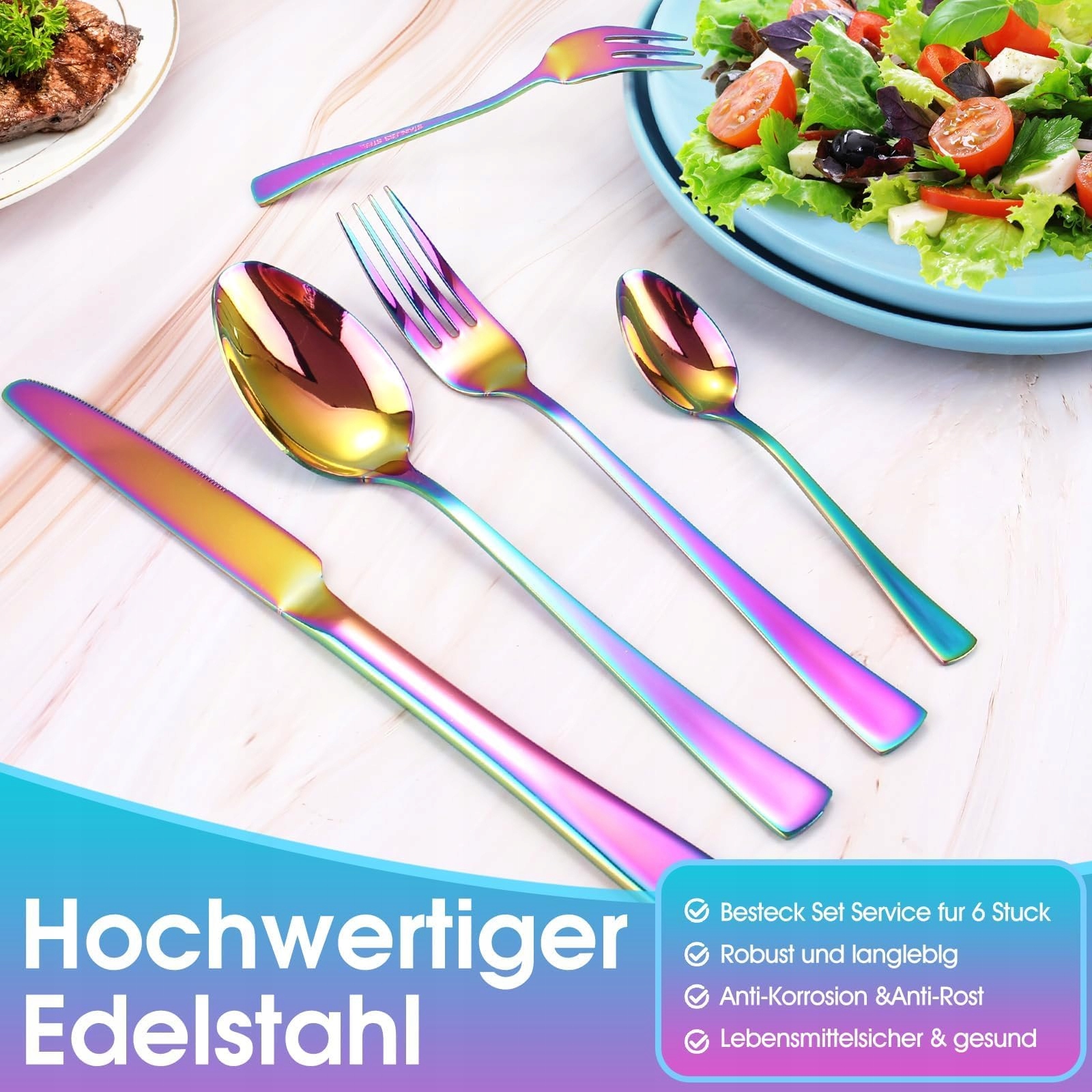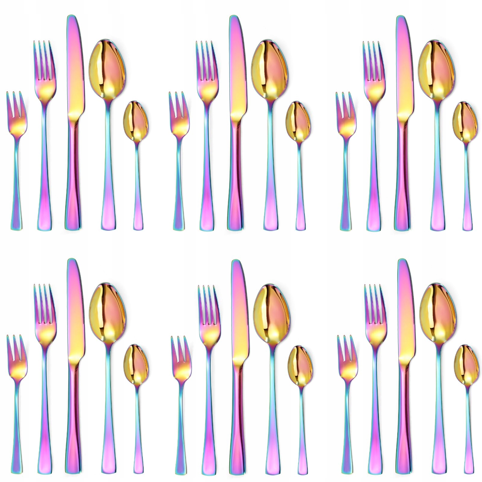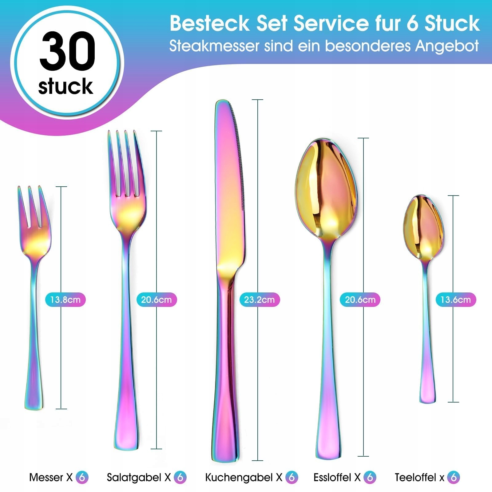 Zestaw sztućców Targzier dla 6 osób, 30 elementów, sztućce tęczowe, zestaw sztućców tęczowych z nożem, widelcem i łyżką ze stali nierdzewnej, polerowane na wysoki połysk, nadające się do zmywarki