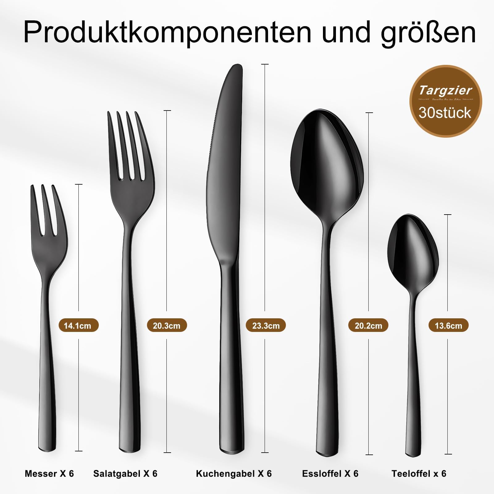 Zestaw sztućców Targzier Schwarz dla 6 osób, 30-częściowy zestaw sztućców ze stali nierdzewnej czarny, czarny zestaw sztućców z nożem, widelcem, łyżką, eleganckie sztućce ze stali nierdzewnej, nadające się do zmywarki.