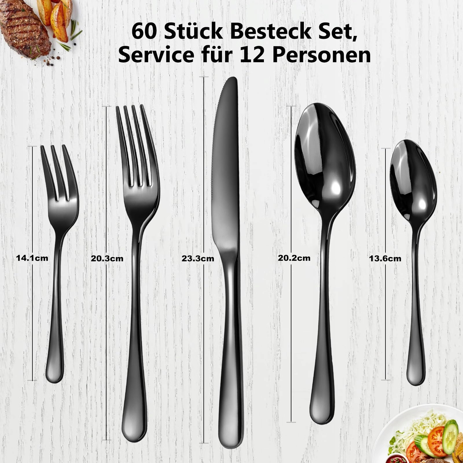 【60-częściowy zestaw sztućców dla 12 osób】60-częściowy zestaw sztućców, czarny zestaw naczyń składający się z 10 widelców, 10 łyżek, 10 widelców sałatkowych, 10 łyżeczek, 10 noży, ten czarny zestaw sztućców Targzier nadaje się do mycia w zmywarce i spełnia wszystkie Twoje potrzeby kulinarne.