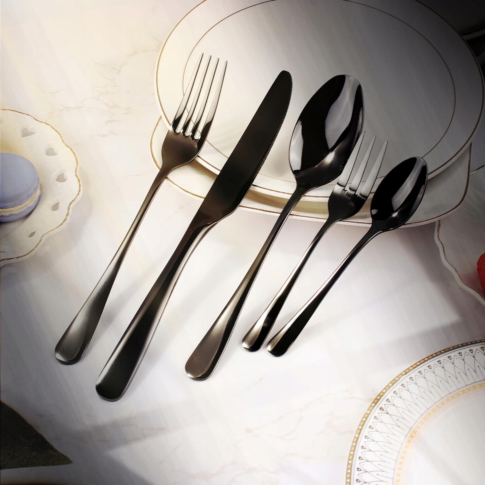 【Wysokiej jakości i nadające się do mycia w zmywarce】Ten czarny zestaw sztućców ze stali nierdzewnej dzięki polerowaniu na wysoki połysk ma gładkie krawędzie, co zapewnia bezpieczeństwo podczas użytkowania. Najważniejsze jest to, że sztućce w kolorze czarnym są oczywiście przystosowane do mycia w zmywarce.