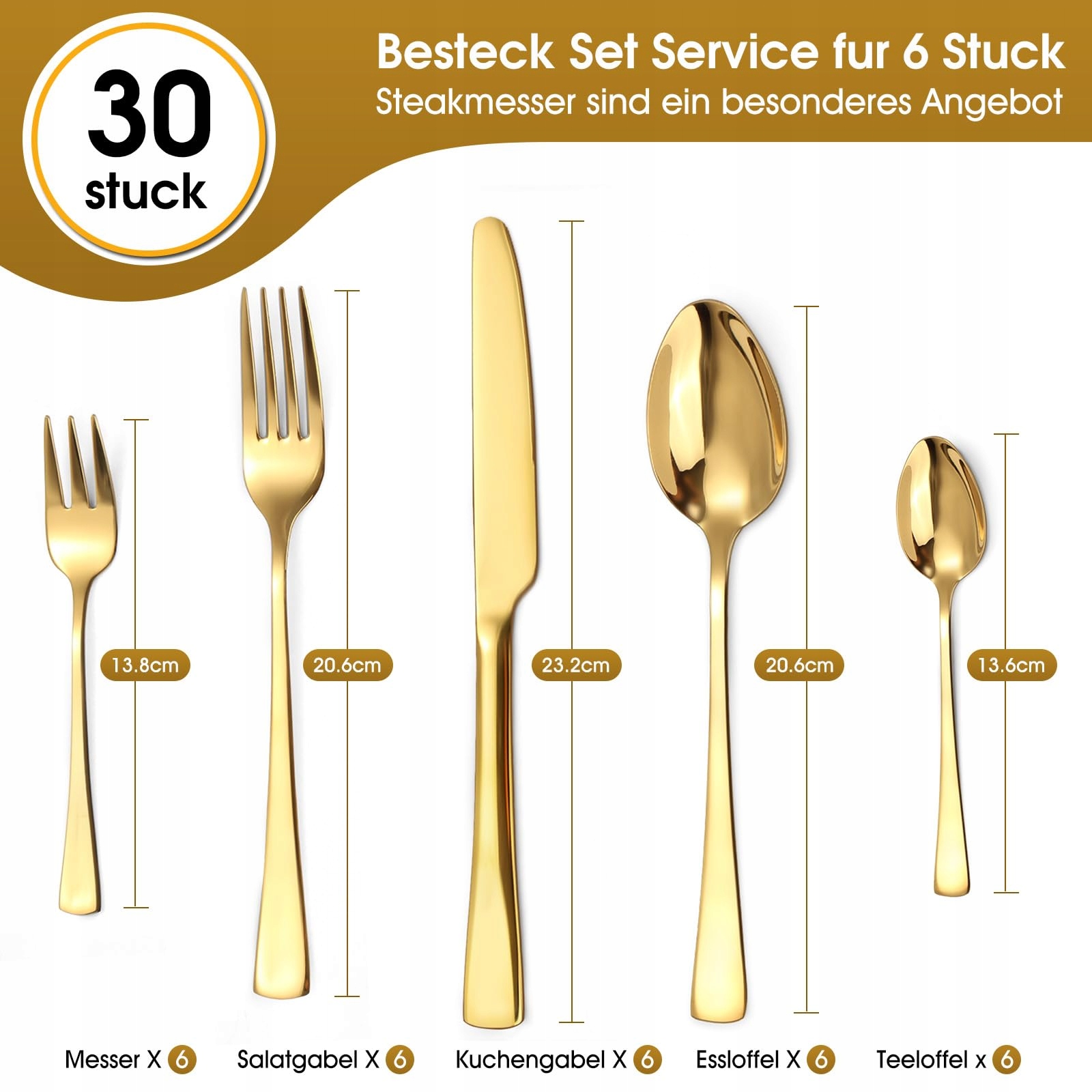 【30-częściowy zestaw sztućców dla 6 osób】: Nasz złoty zestaw sztućców zawiera 6 noży stołowych, 6 łyżek stołowych, 6 widelców stołowych, 6 łyżeczek do herbaty oraz 6 widelczyków do deserów, idealny dla większości gospodarstw domowych z wieloma osobami i na wszystkie codzienne potrzeby.