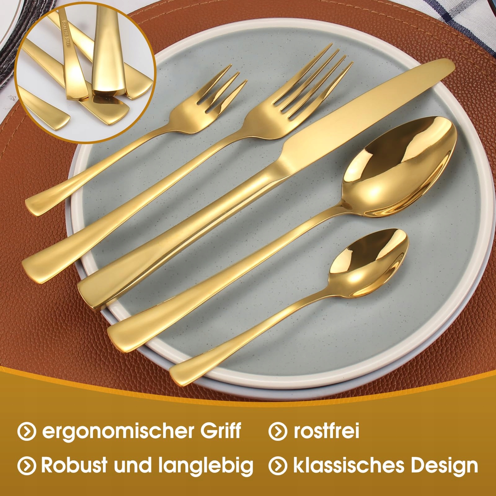 【Wysokiej jakości stal nierdzewna】Zestaw sztućców Targzier Gold wykonany jest z wysokiej jakości stali nierdzewnej, bezpiecznej dla żywności, odpornej na korozję i rdzę, nie pozostawia żadnych pozostałości ani zapachów jak inne materiały. Nasze zestawy sztućców są jednocześnie solidne i trwałe, co gwarantuje, że nie tylko nie łatwo się wyginają, ale także zapewniają długotrwałe użytkowanie.