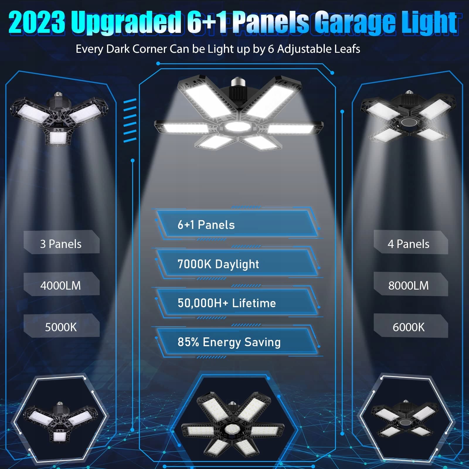 �[Design 6+1 paneli & super jasna lampa garażowa LED]: Z 6 ultra jasnymi regulowanymi panelami LED + 1 centralną świecącą powierzchnią, aby osiągnąć pełne oświetlenie 360°, bez cieni. Środkowa świecąca powierzchnia lampy garażowej LED również świeci i zwiększa obszar oświetlenia. Nowe ulepszone chipy LED SMD2835 lampy warsztatowej, które w sumie dają 18500 lumenów, CRI80+, 7000K chłodnej białej lampy garażowej LED oświetlą Twój garaż / piwnicę / strych.