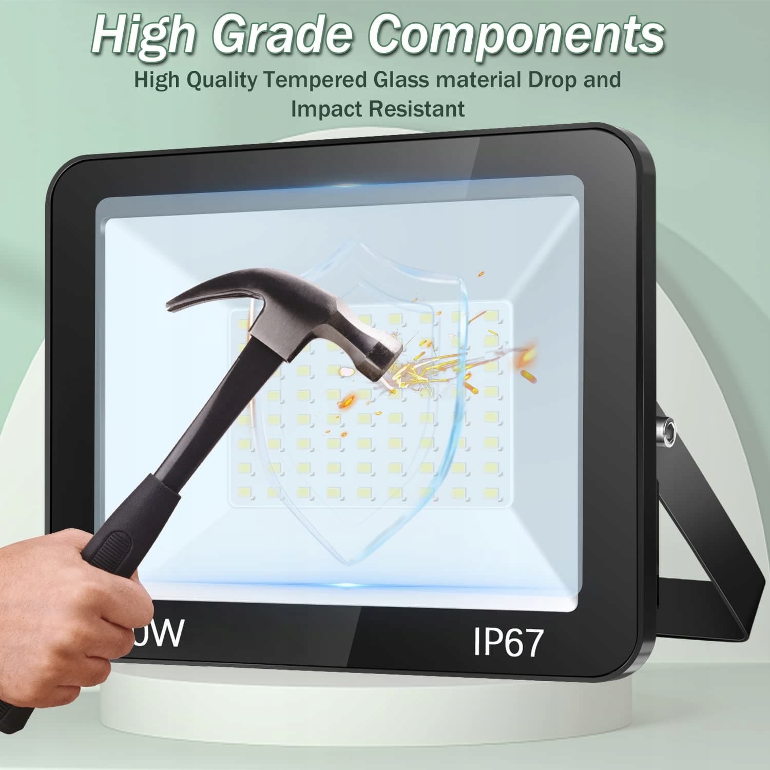 Stylowy design: Reflektor LED 50W z wysokiej jakości aluminium lotniczego + szkło hartowane – szkło hartowane o wysokiej przezroczystości zapewnia silną przepuszczalność światła, nadaje urządzeniu stylowy wygląd i osiąga maksymalną powierzchnię oświetlenia