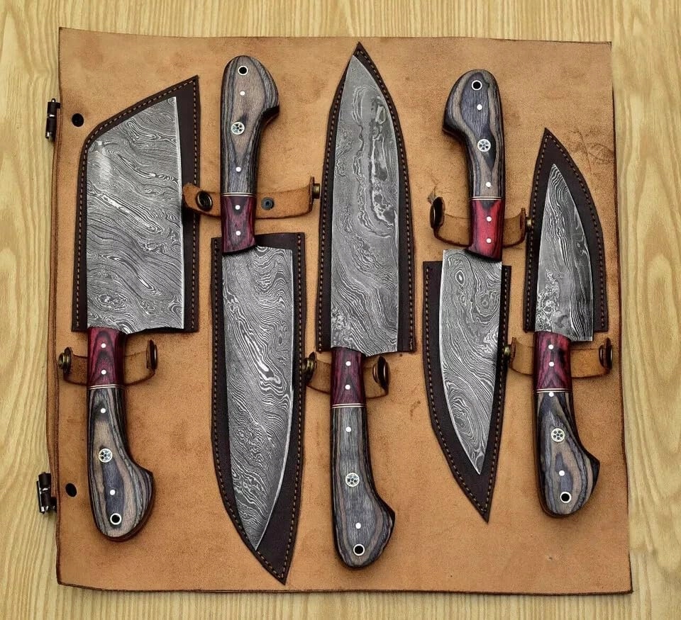 Ręcznie robiony zestaw noży kuchennych z damasceńskiej stali 5 szt. z torbą na noże z 5 kieszeniami i skórzanym pokrowcem