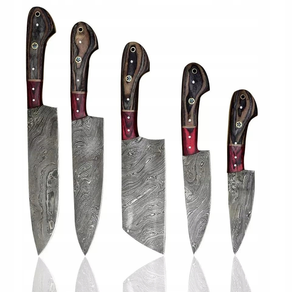 Rączka wykonana jest z czerwonego drewna Pakka. Dzięki temu jest wygodna i ma długotrwały czerwony kolor. Niestandardowy lub ręcznie robiony unikalny zestaw noży kuchennych ze stali damasceńskiej