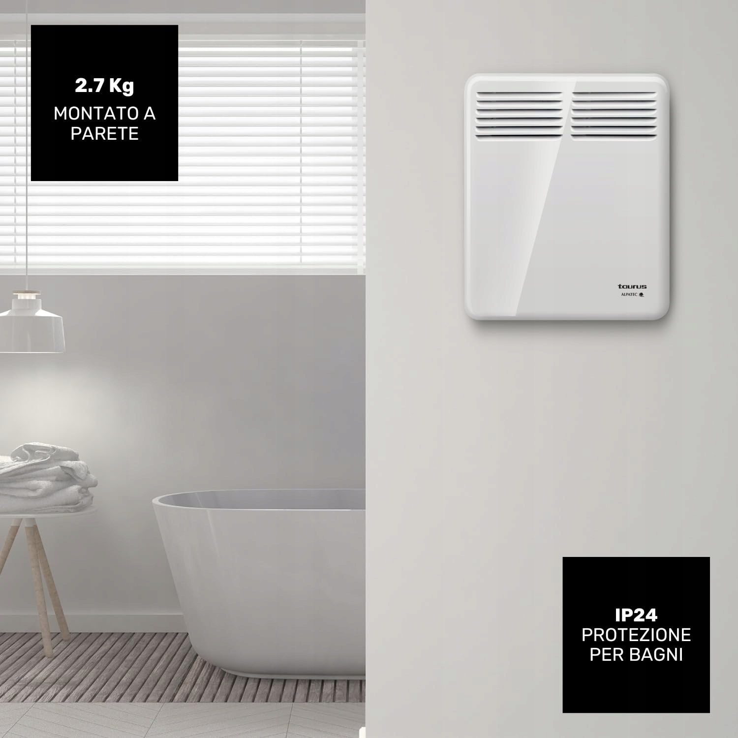Taurus CHTA 500 – Elektryczny konwektor 500 W, IP24 do użytku w łazience, montaż na ścianie, wyświetlacz cyfrowy, programowalny, ochrona przed przegrzaniem, czujnik 'otwarte okno', biały