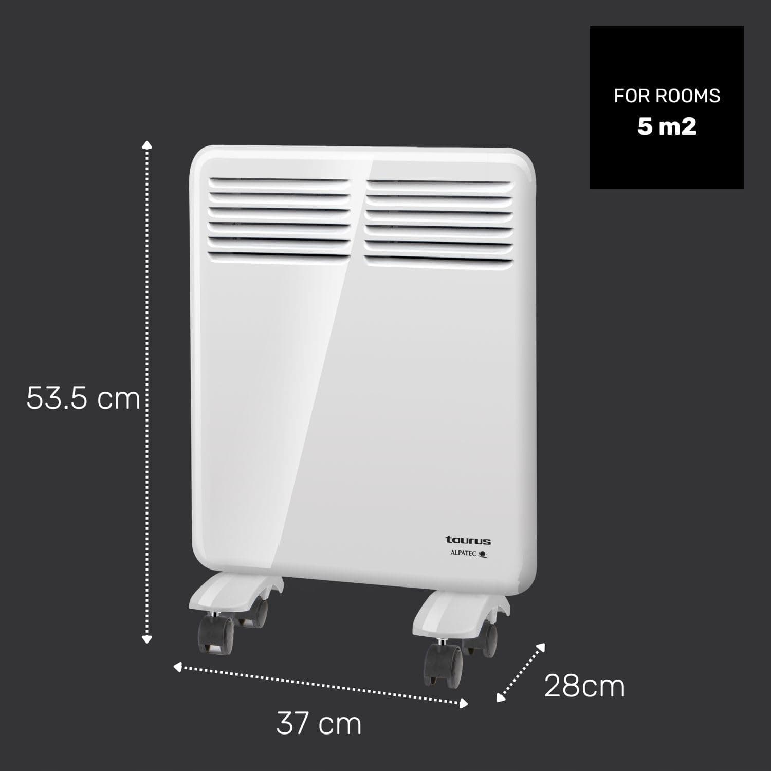 Ściana i kółka: Kompaktowy i smukły konwektor ścienny o wymiarach 53 x 37 cm, z możliwością montażu na ścianie lub w pozycji pionowej z nóżkami i kółkami dla łatwego i wygodnego transportu.