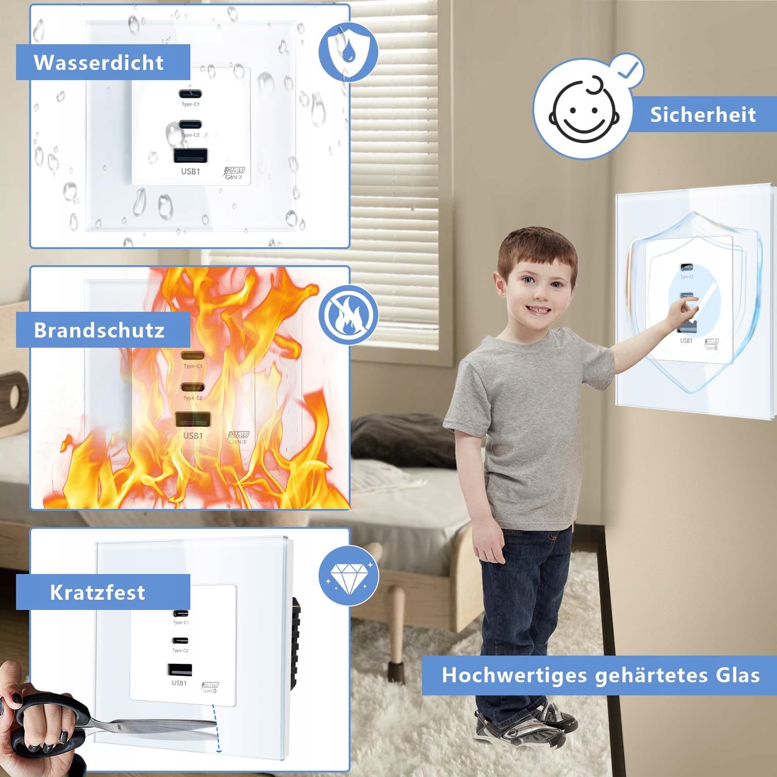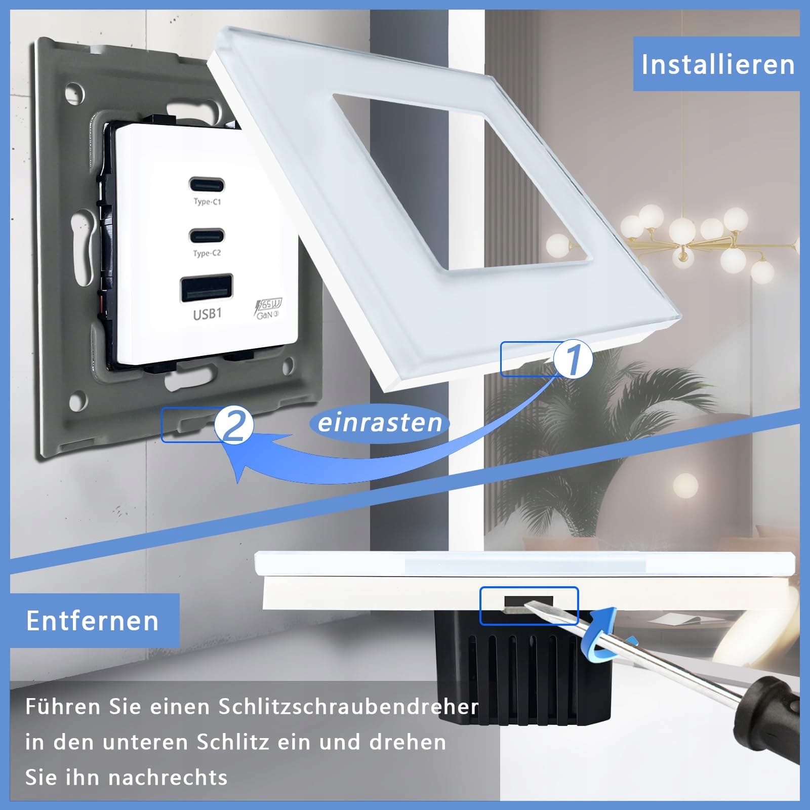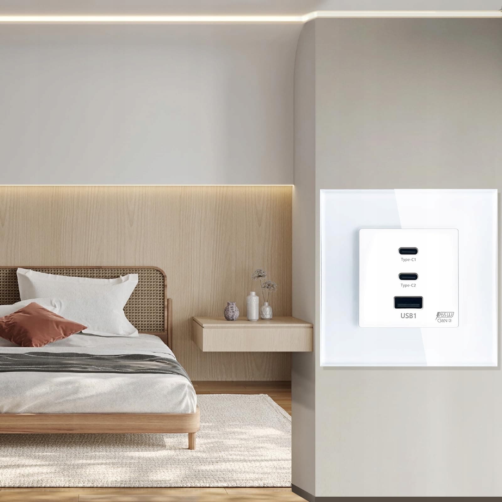Gniazdo Schuko TAWOIA, 65W Typ C i szybkie ładowanie USB dla telefonów komórkowych, tabletów i laptopów, ramka ze szkła kryształowego gniazdo podtynkowe Usb C Białe 86 * 86mm