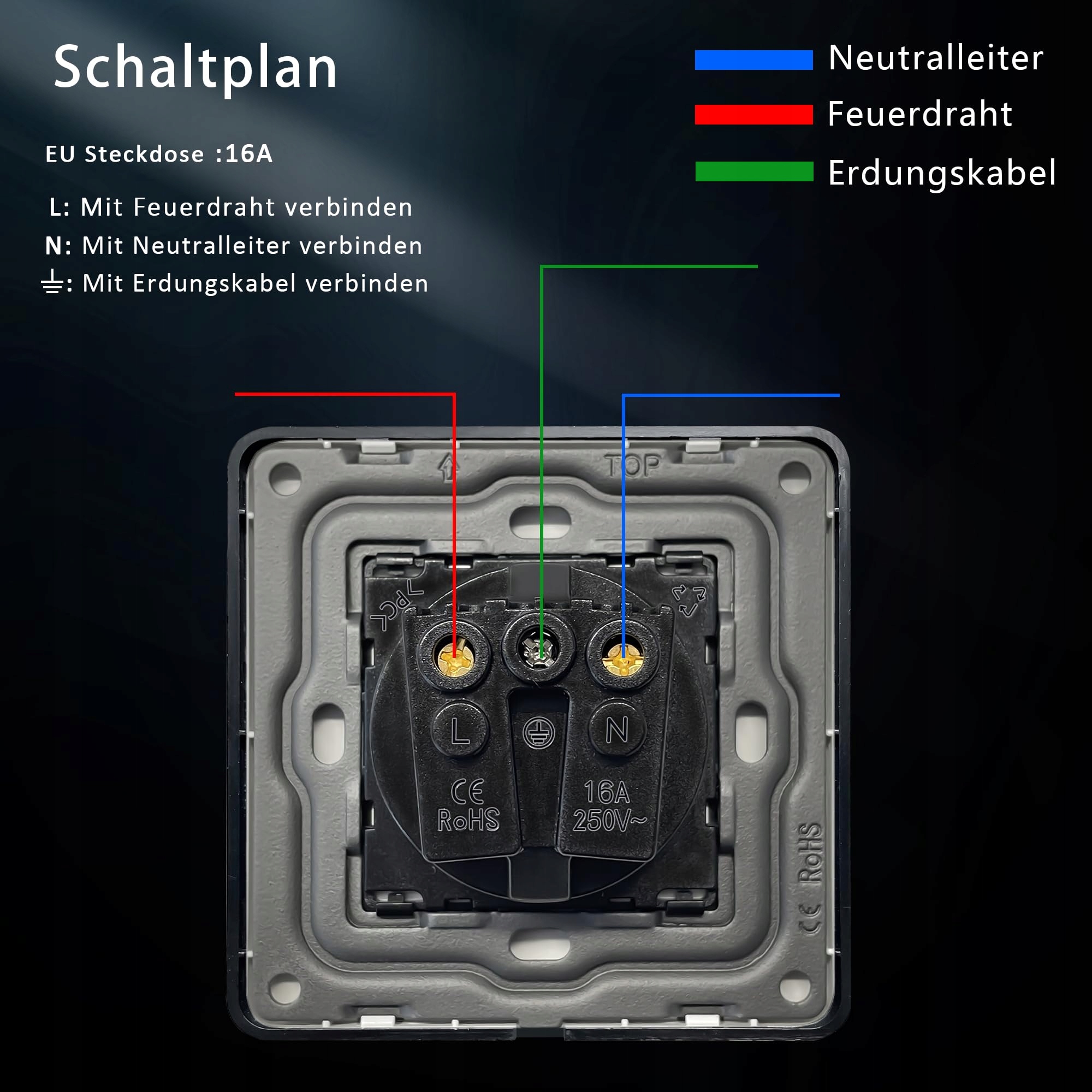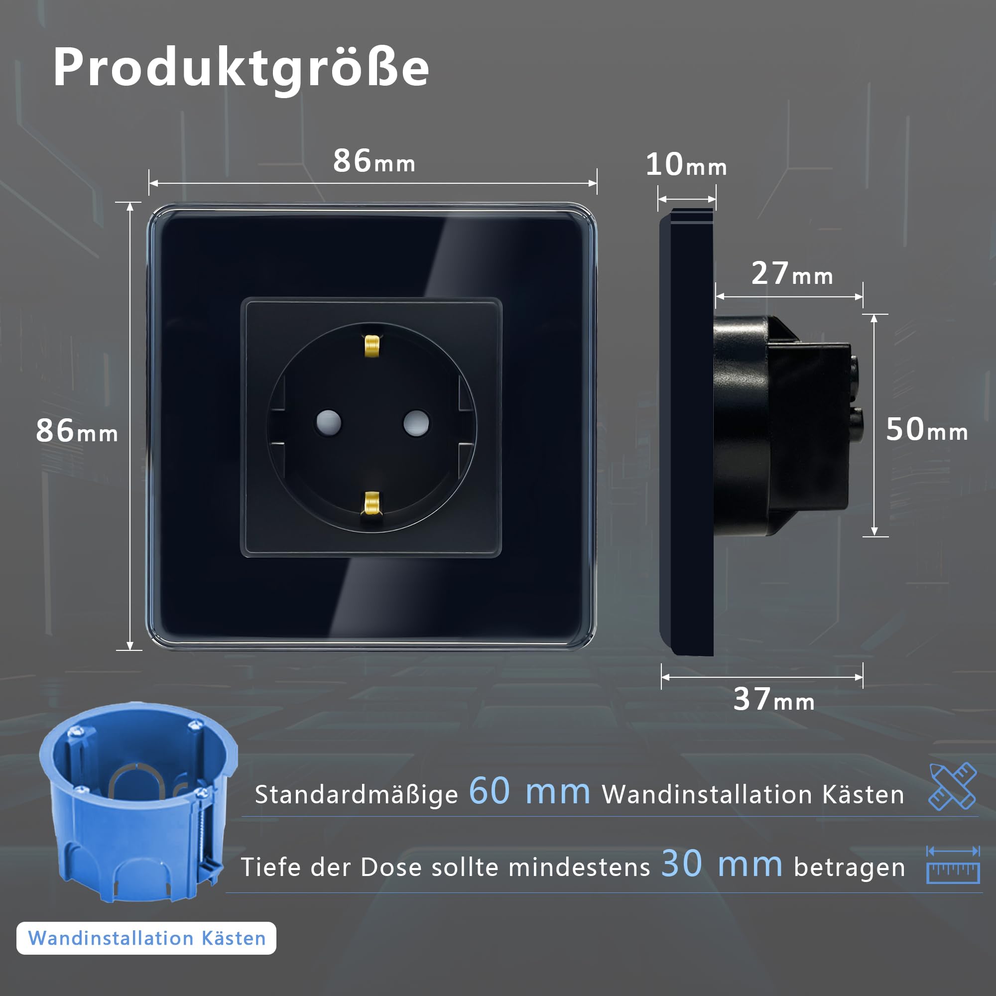 Łatwa instalacja: Zazwyczaj należy osobno podłączyć przewód L, przewód N i przewód uziemiający. Głębokość montażu musi wynosić więcej niż 30 mm.