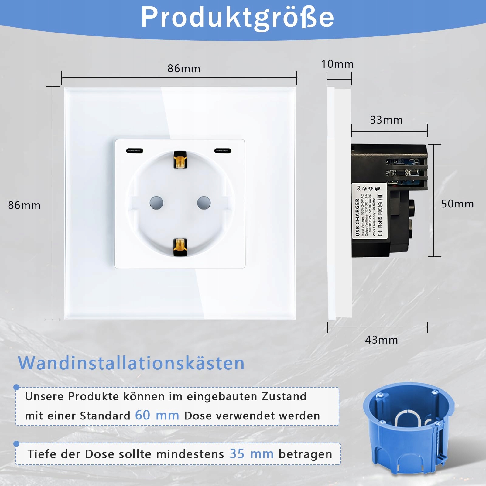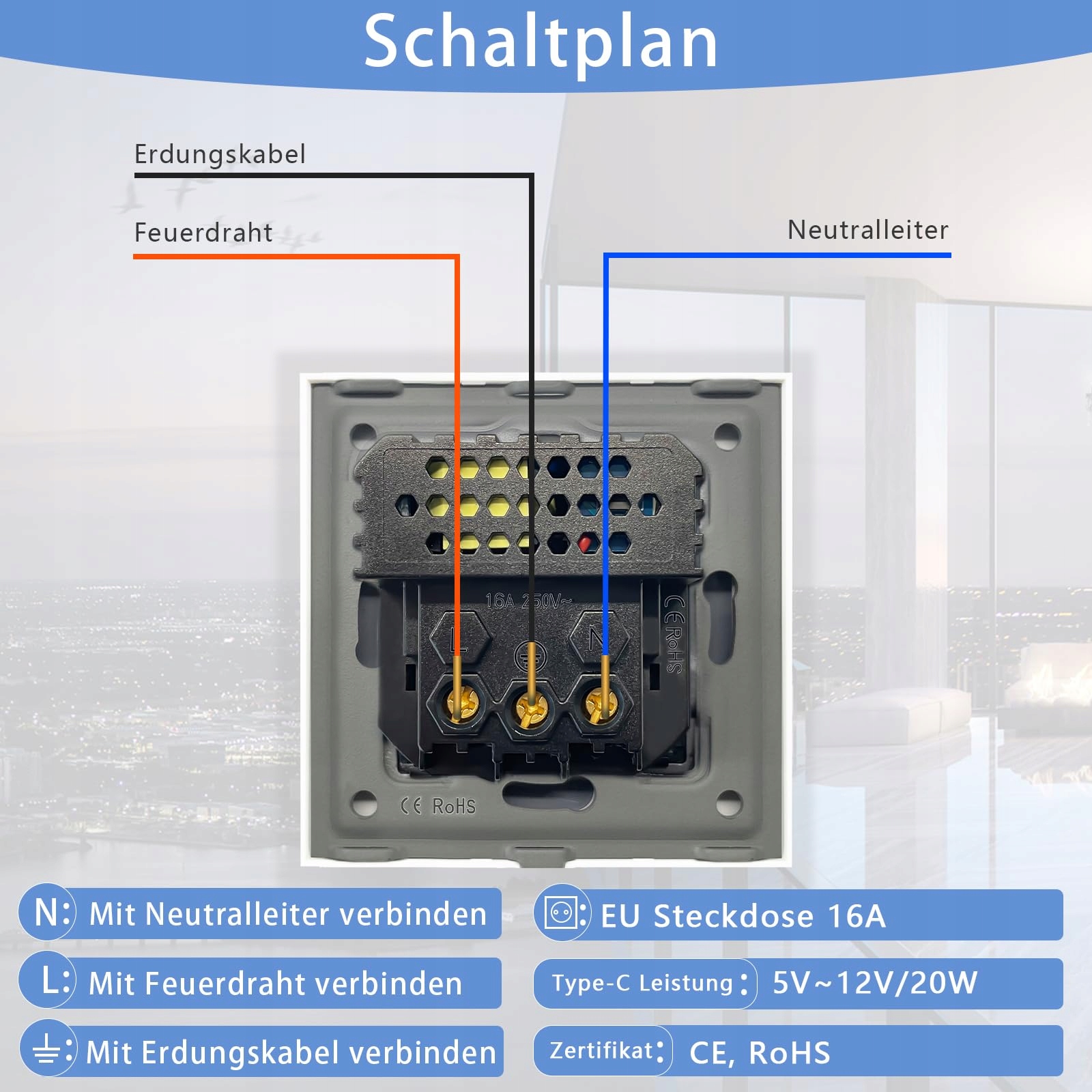 Łatwa instalacja: Zazwyczaj należy osobno podłączyć przewód L, przewód N i przewód uziemiający. Głębokość montażu musi wynosić więcej niż 35 mm.