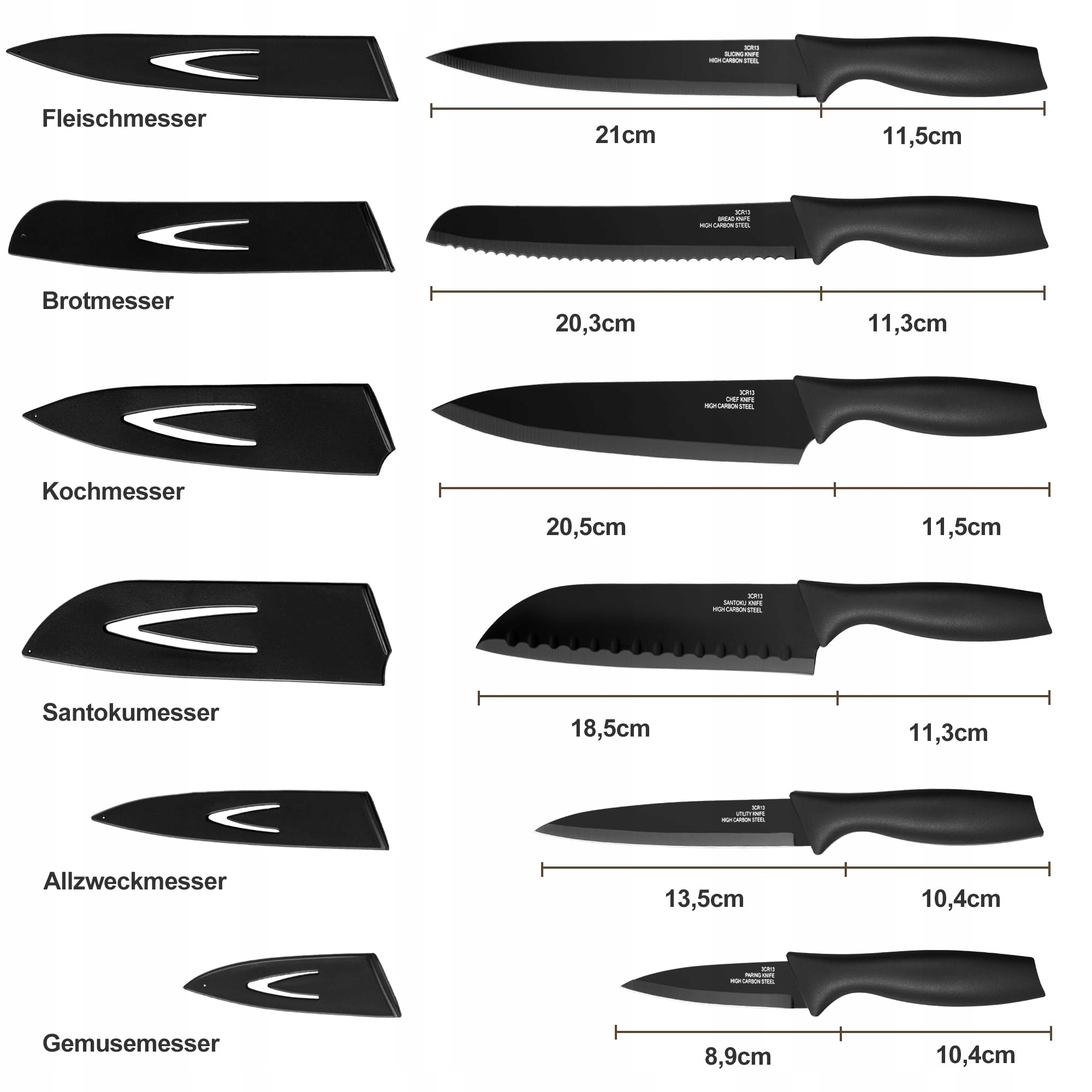 Kompletny zestaw z 6 osłonami: Zestaw noży kuchennych TEAMFAR 6-częściowy zawiera 1 nóż kuchenny, 1 nóż santoku, 1 nóż do mięsa, 1 nóż do chleba, 1 nóż uniwersalny i 1 nóż do obierania, każdy nóż jest dostarczany z odpowiednią osłoną ostrza, która umożliwia bezpieczne przechowywanie w szufladzie i zapewnia, że ostrza dłużej pozostaną ostre, 6 różnych kształtów noży kuchennych może spełnić większość Twoich podstawowych zadań w kuchni, a nowoczesny kolor podniesie estetykę Twojej kuchni, ponadto ten zestaw noży będzie atrakcyjnym i praktycznym prezentem
