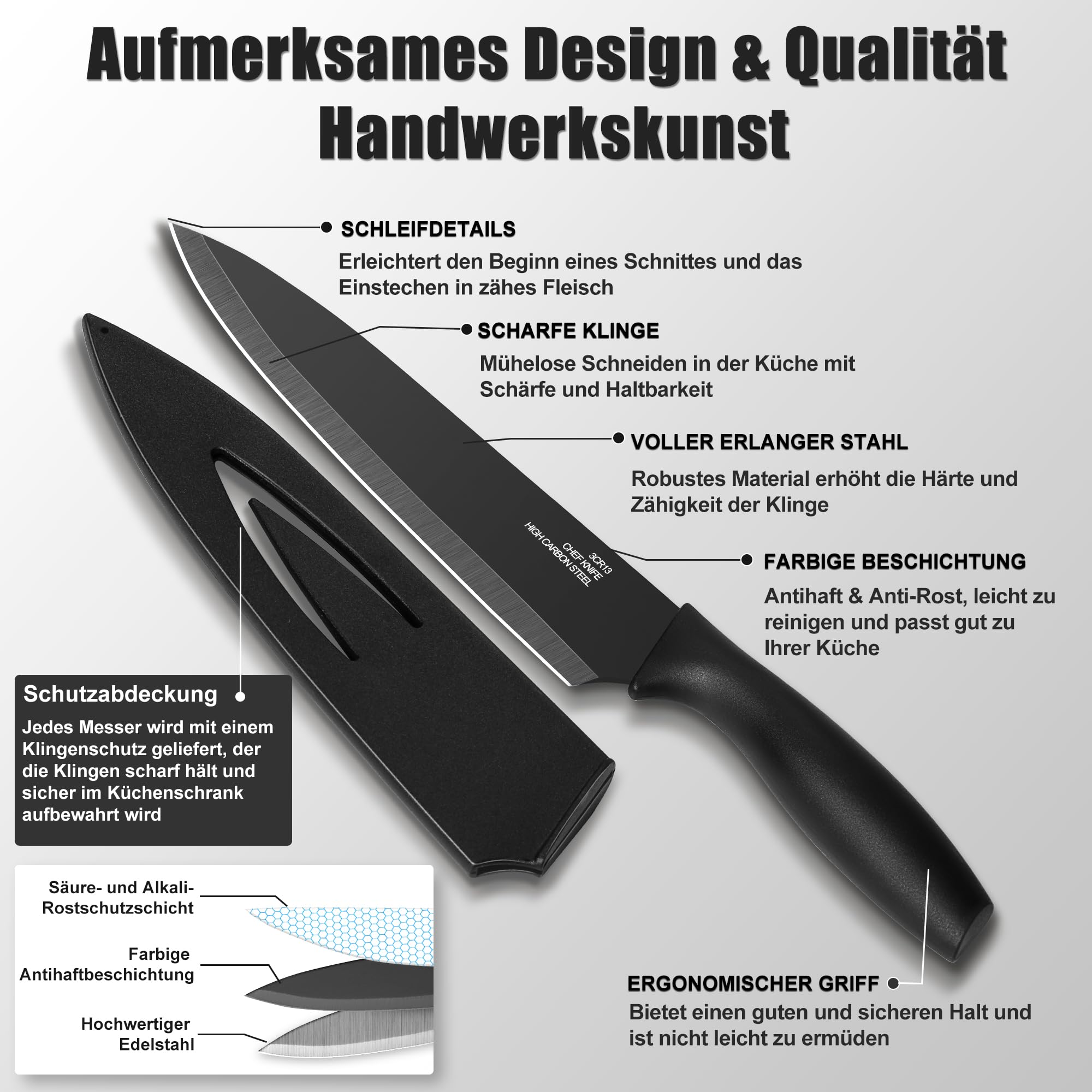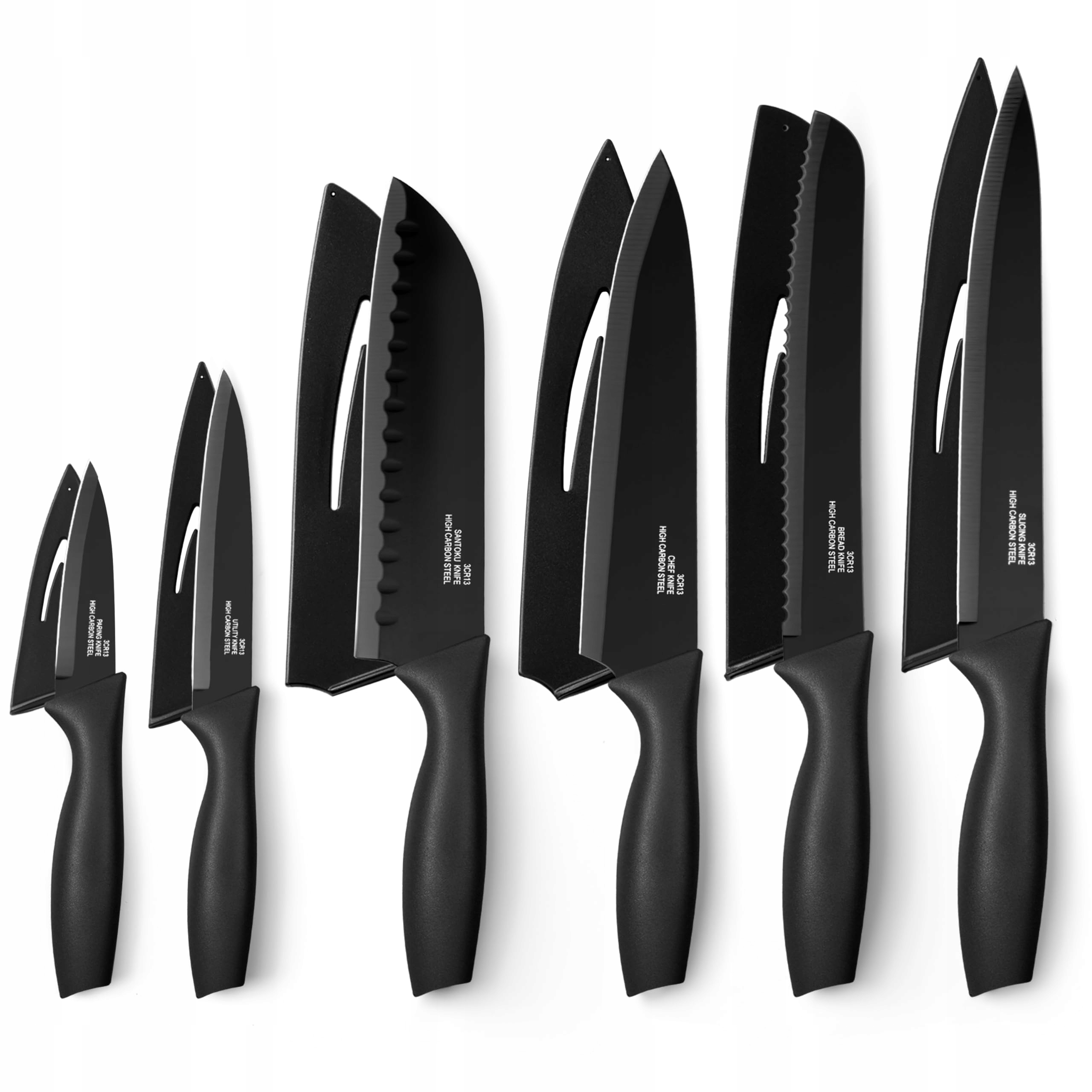 Zestaw noży kuchennych TEAMFAR 6-częściowy, stal nierdzewna z osłoną, ostry zestaw noży z nożem kuchennym, nożem do chleba, nożem santoku, nożem do mięsa, nożem do obierania, nożem uniwersalnym, powłoka nieprzywierająca, czarny