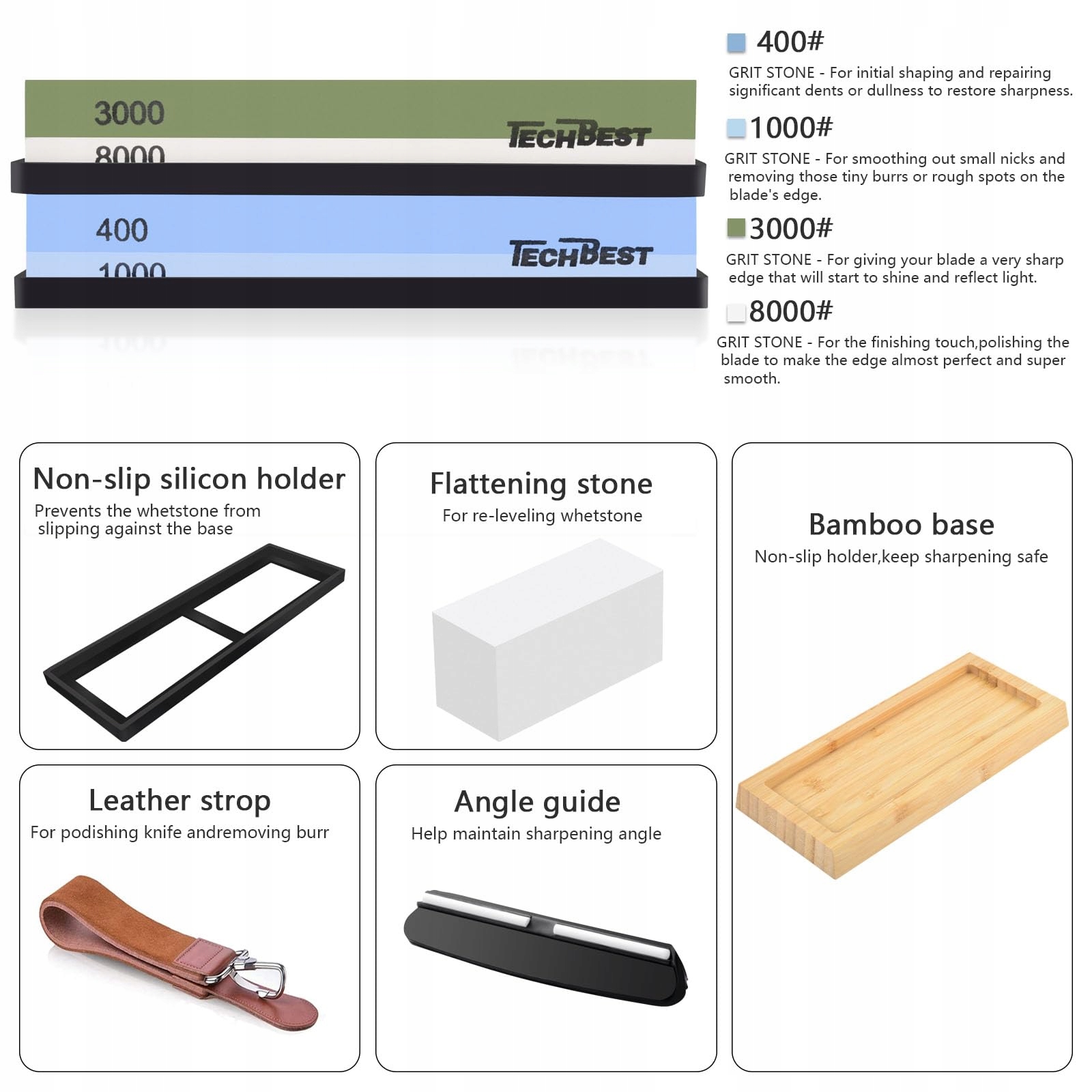 TechBest Kamień szlifierski Zestaw noży - Kamień szlifierski o gradacji 400/1000 3000/8000 z antypoślizgową bambusową podstawą, kamieniem płaskim, prowadnicą kątową i paskiem skórzanym