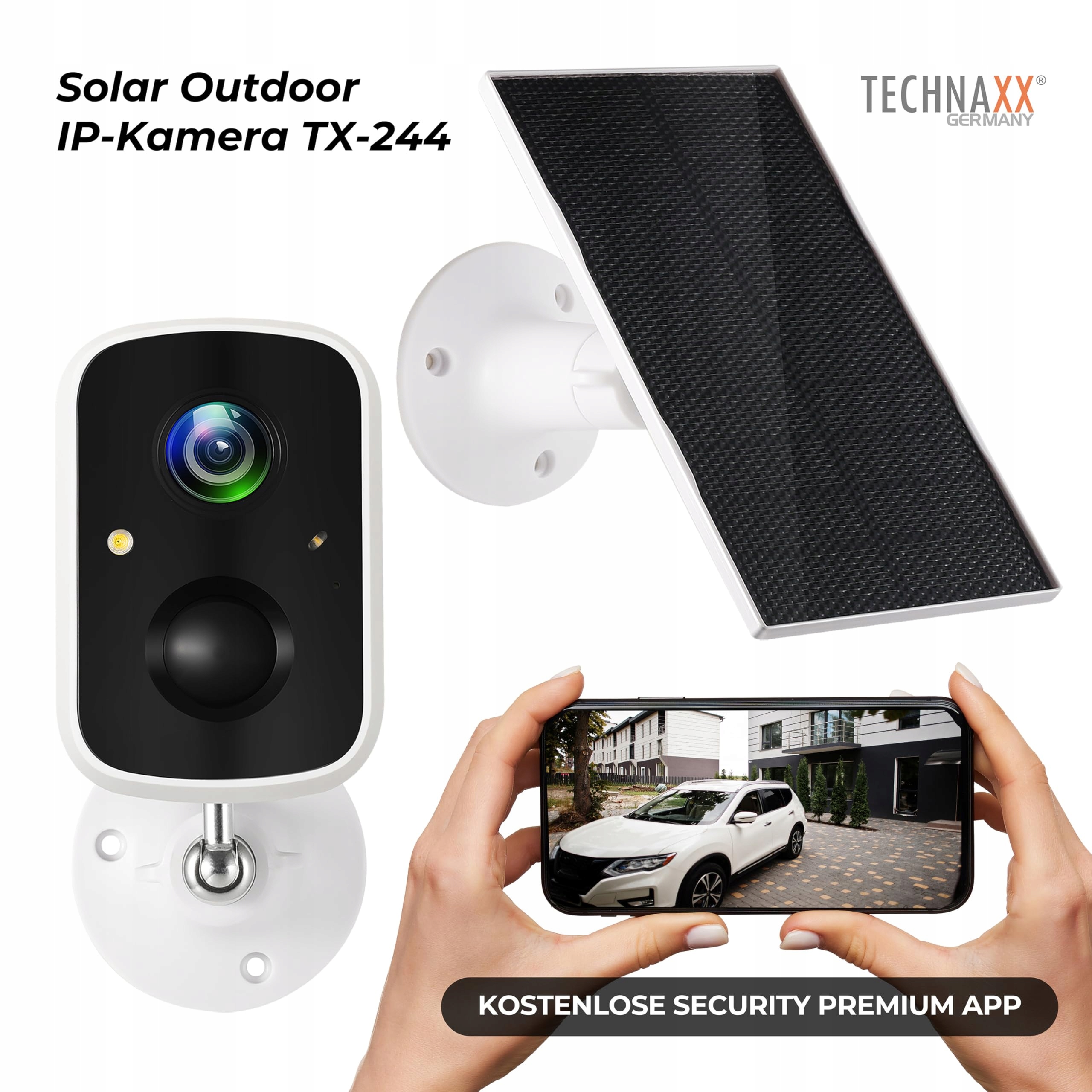 Technaxx Solar Outdoor IP-Kamera TX-244 z czujnikiem ruchu i wbudowaną baterią - 4 MP FullHD-rozwiązanie wideo Kamera do monitoringu na zewnątrz WiFi, IP65, tryb nocny, kąt widzenia 110°