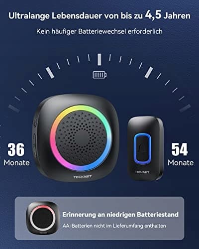 TECKNET Dzwonek bezprzewodowy, bezprzewodowy dzwonek do drzwi zasilany bateriami z światłem RGB, 60 melodii, wodoodporny IP66 zestaw dzwonka do drzwi zewnętrznych, zasięg 400m, zestaw dzwonka do drzwi z żywotnością 4,5 roku