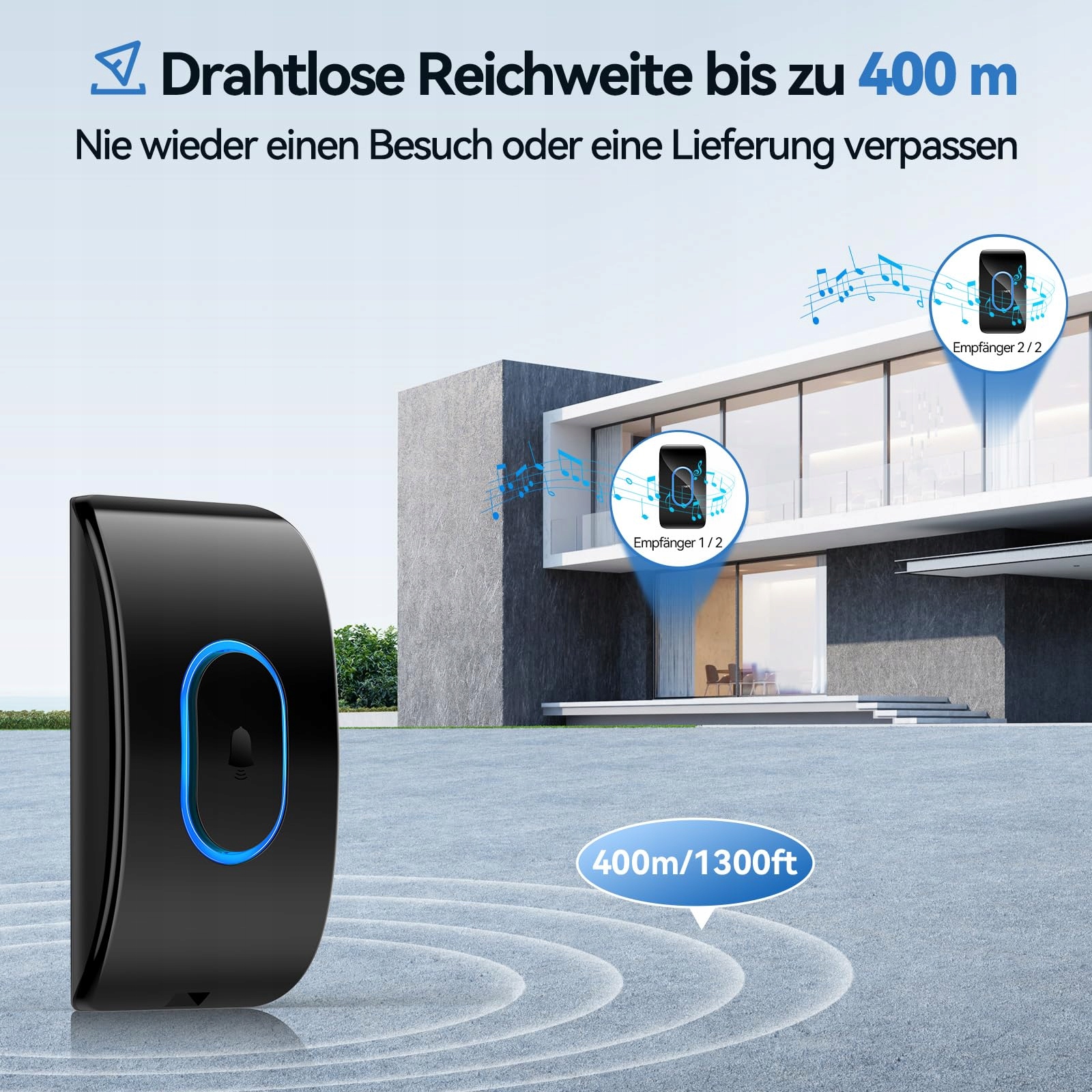 【400 metrów zasięgu bezprzewodowego】Bezprzewodowy dzwonek ma niezawodny zasięg 400 metrów, bez zakłóceń od innych urządzeń w Twoim domu lub w sąsiednich domach. Nigdy więcej nie przegapisz odwiedzającego, nawet jeśli jesteś w kilku pomieszczeniach od dzwonka lub na innym piętrze. Niebieskie LED-owe światło błyskowe daje Ci sygnał wizualny.