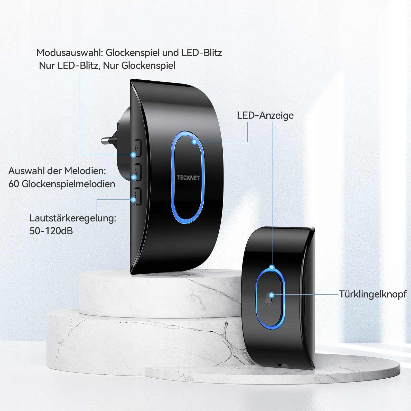【5 poziomów głośności & 60 dzwonków】Odbiornik dzwonka ma 5 regulowanych poziomów głośności z maksymalnym ustawieniem 120 dB. Opcje melodii z 60 dzwonkami obejmują klasyczne dzwonki oraz rytmiczne melodie dla każdego gustu. Wyłącz bezprzewodowy wodoodporny dzwonek, gdy nie chcesz dźwięku, a zamiast tego daj się powiadomić wizualnie przez praktyczną diodę LED, gdy ktoś dzwoni