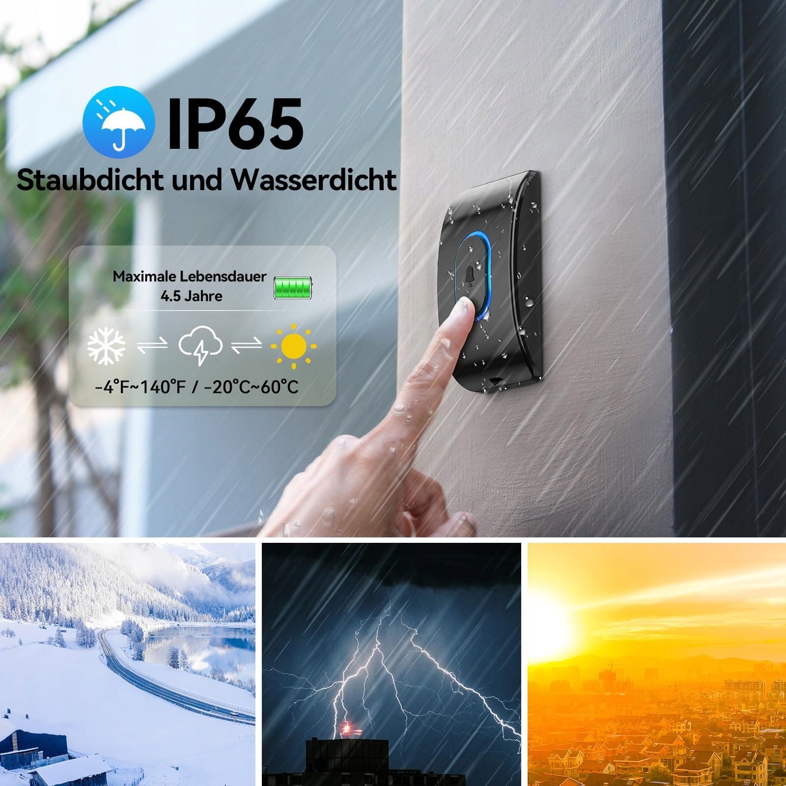【Wodoodporny i pyłoszczelny】Nadajnik jest odporny na krople deszczu, a wodoodporność i pyłoszczelność IP65 zapewniają doskonałe działanie na zewnątrz. Dzwonek działa w temperaturze od -20 do +60 °C, wytrzymując trudne warunki pogodowe