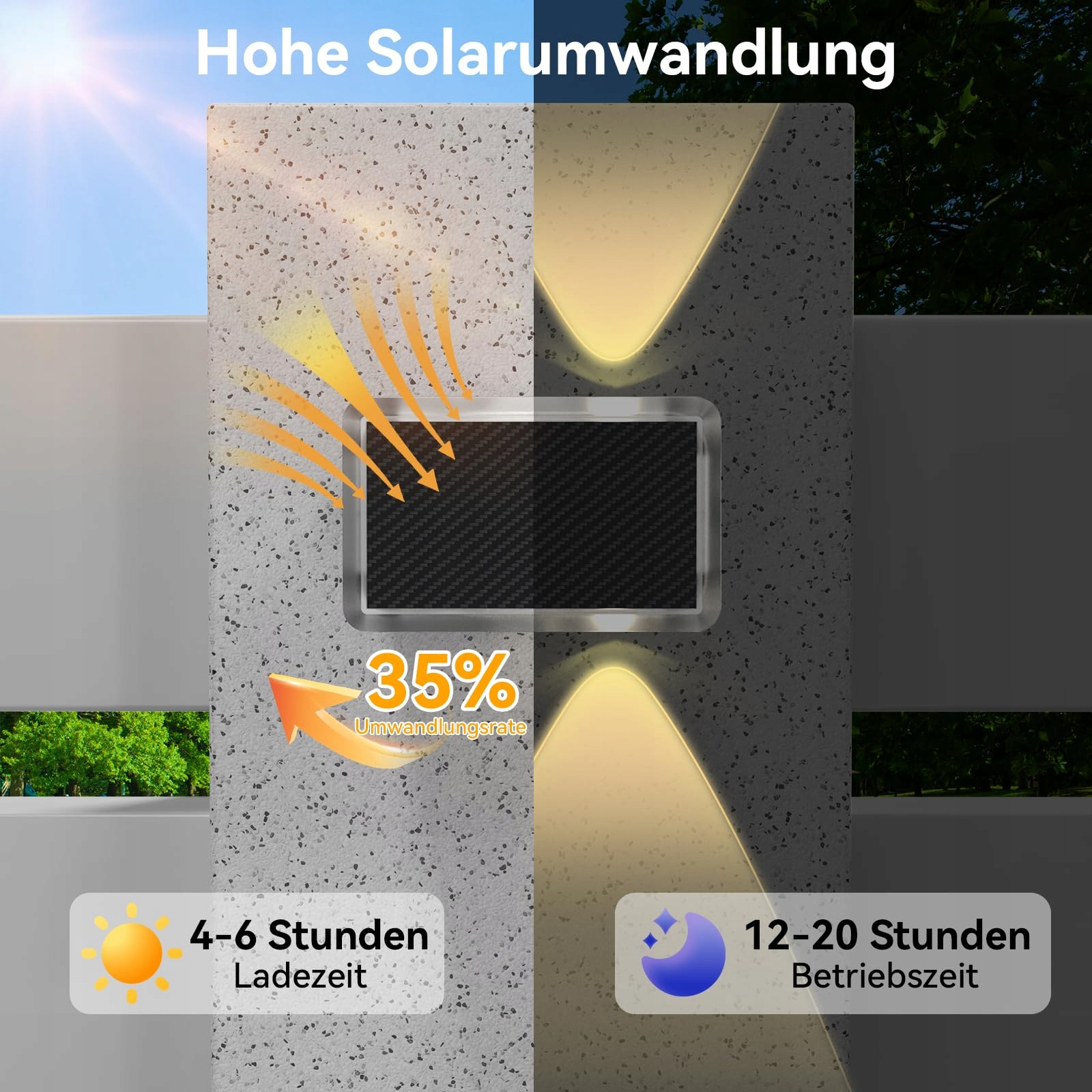 【Lampy góra i dół na zewnątrz】Te solarne kinkiety na zewnątrz mają konstrukcję światła skierowanego w górę i w dół, co skutecznie rozszerza obszar oświetlenia i zapewnia jasne, równomierne rozproszenie światła, poprawiając widoczność w nocy. Idealne na tarasy, ogrody i wejścia – dla romantycznej i bezpiecznej atmosfery nocą