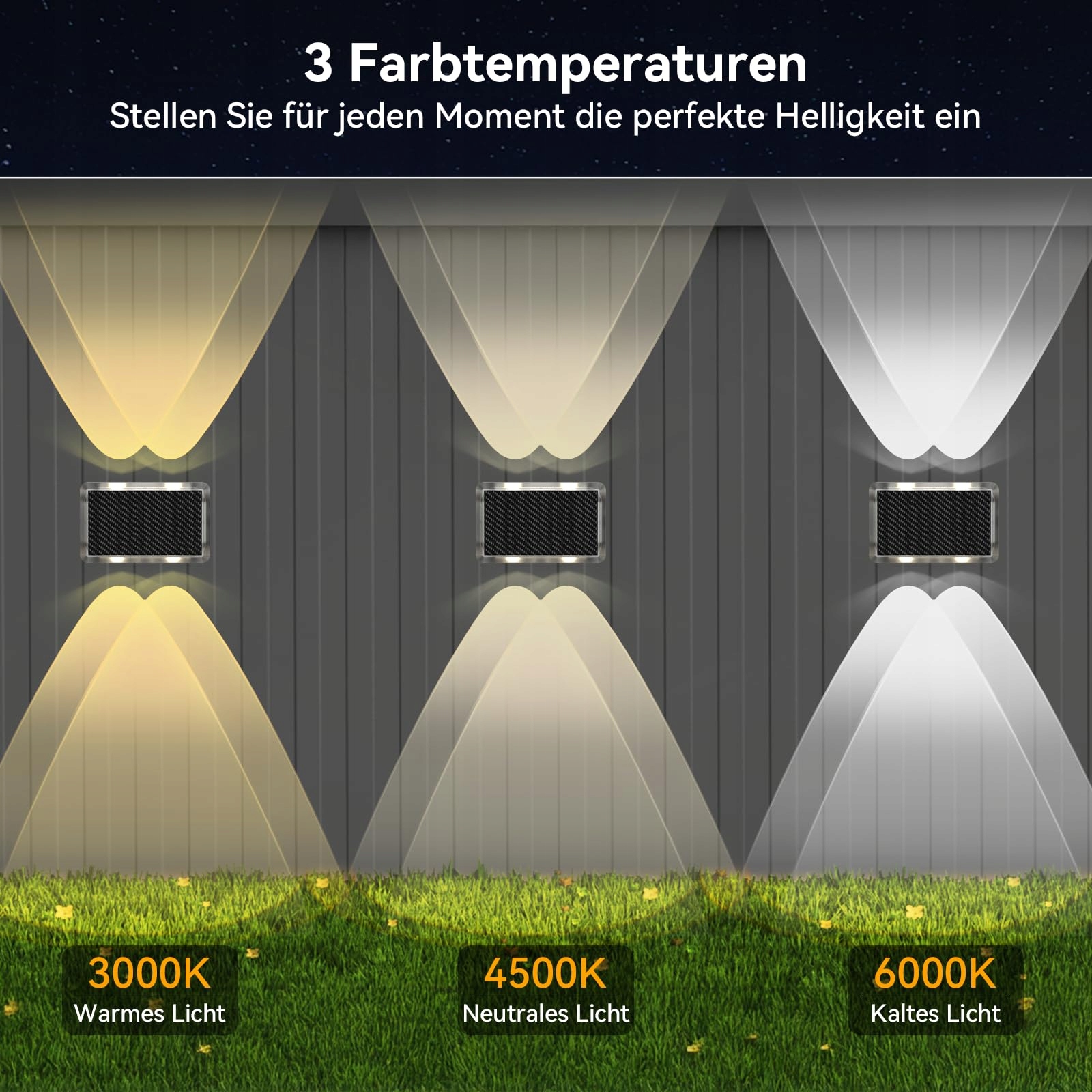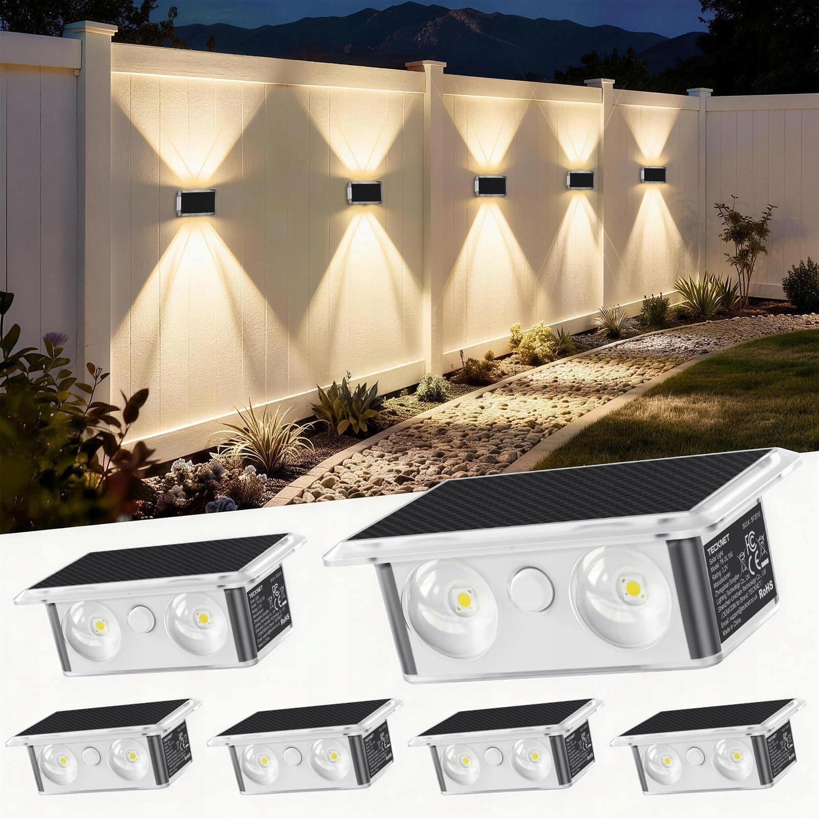TECKNET Lampy solarne na zewnątrz, zewnętrzne kinkiety odporne na warunki atmosferyczne, góra i dół, wodoodporne IP66, 3 tryby kolorów, lampa solarna na zewnątrz do ogrodów, tarasów, balkonów, werand, ogrodzeń, 6 sztuk