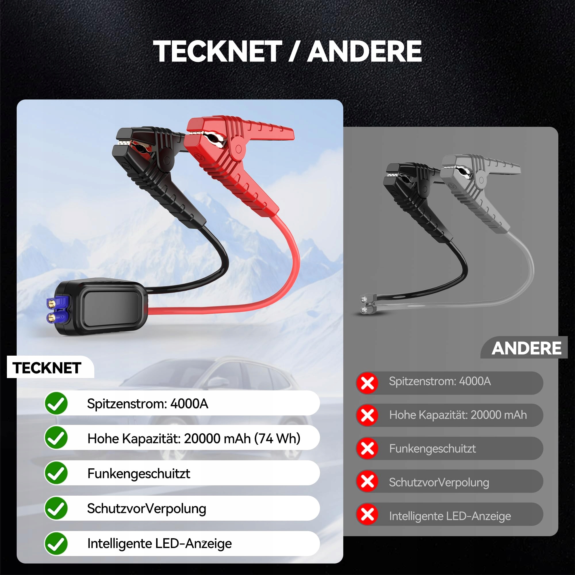 TECKNET Powerbank do rozruchu samochodu – Powerbank do rozruchu samochodu 4000A 12V, do 8.5L benzyny/8.5L diesla, z latarką LED, 2 portami szybkiego ładowania USB, wzmacniaczem akumulatora samochodowego i pudełkiem na akcesoria