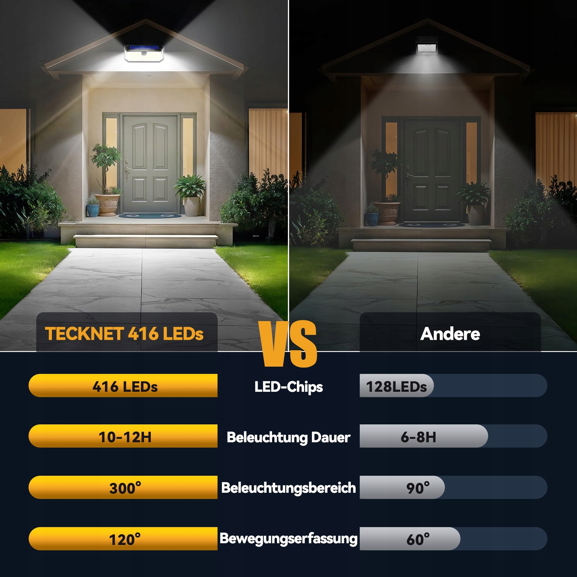 TECKNET lampy solarne z czujnikiem ruchu na zewnątrz 416 LED, 2 sztuki 300° superjasna lampa solarna na ścianę, lampy solarne ogrodowe, ścienne i oświetlenie zewnętrzne wodoodporne IP66