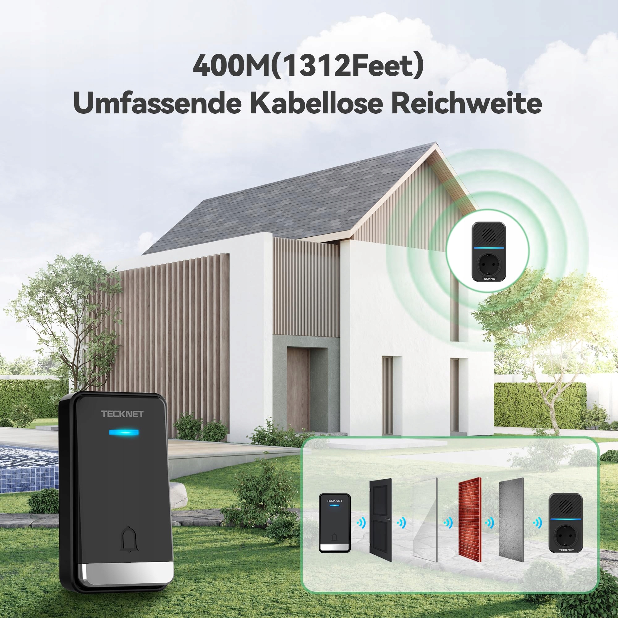 TECKNET Dzwonek bezprzewodowy bez baterii, bezprzewodowy dzwonek do drzwi z gniazdem EU i USB, wodoodporny dzwonek IP65 na zewnątrz, zestaw do drzwi wejściowych, zasięg 400M, 60 dzwonków z lampką LED