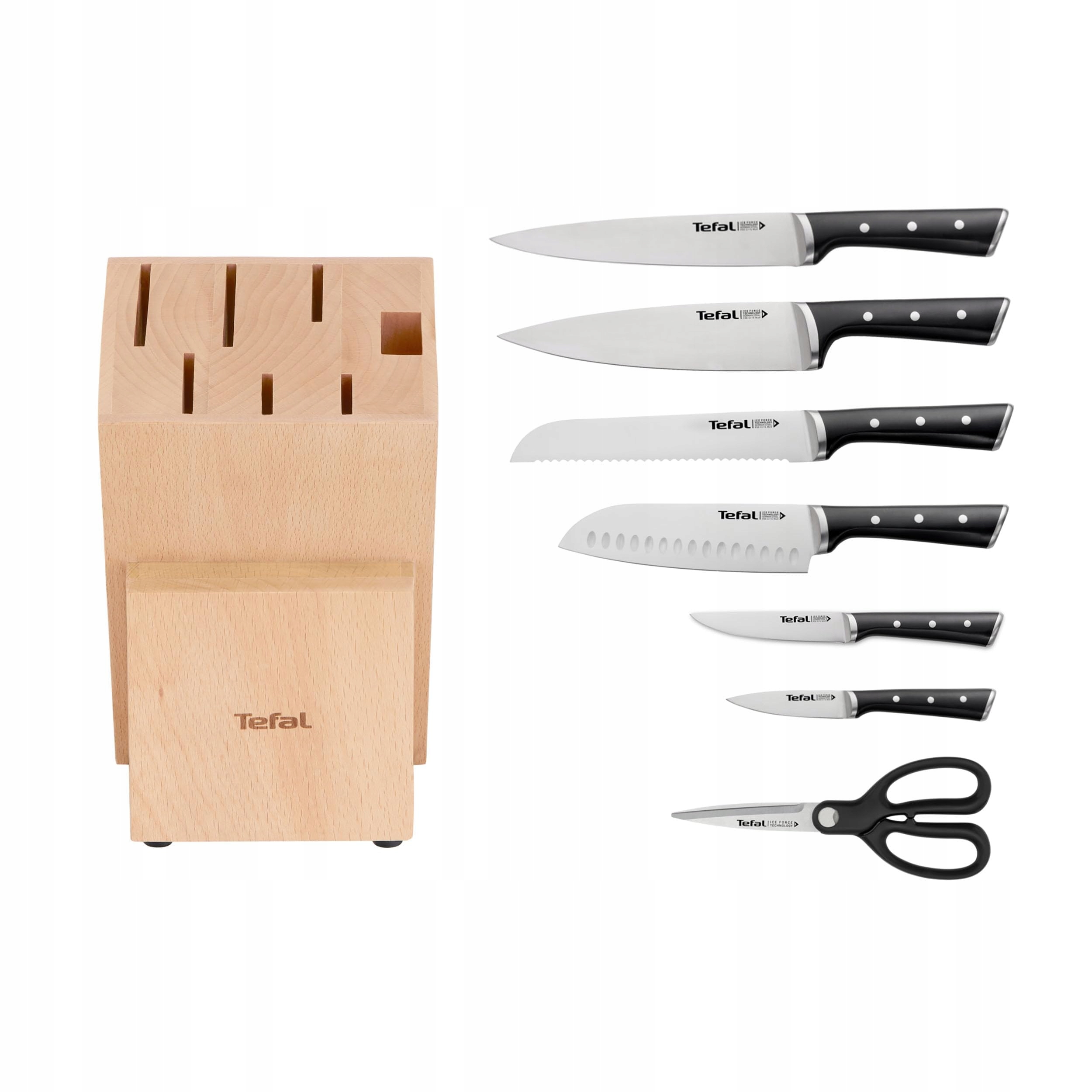 Ten zestaw Ice Force od Tefal zawiera: blok drewniany, nóż kuchenny 20 cm, nóż do mięsa 20 cm, nóż do chleba 20 cm, nóż Santoku 18 cm, nóż uniwersalny 11 cm, nóż obierak 9 cm oraz nożyczki