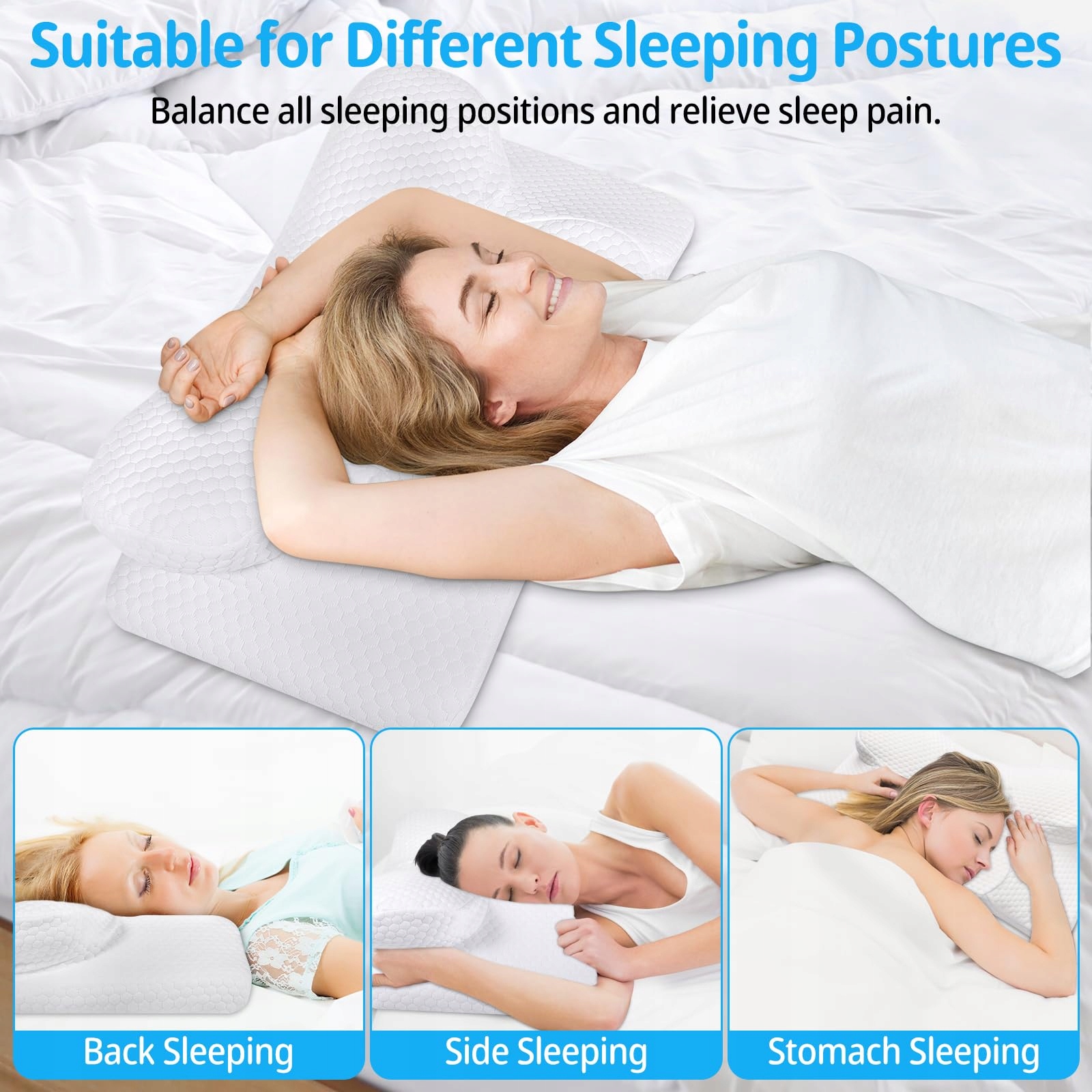 Poduszka z pianki memory z wielofunkcyjną strefą: Ta ergonomiczna poduszka wyposażona jest w pięć unikalnych stref, które idealnie dopasowują się do kształtu głowy, szyi i ramion. Niezależnie od tego, czy śpisz na boku, plecach czy brzuchu, zapewnia optymalne podparcie, aby złagodzić ból szyi i poprawić jakość snu