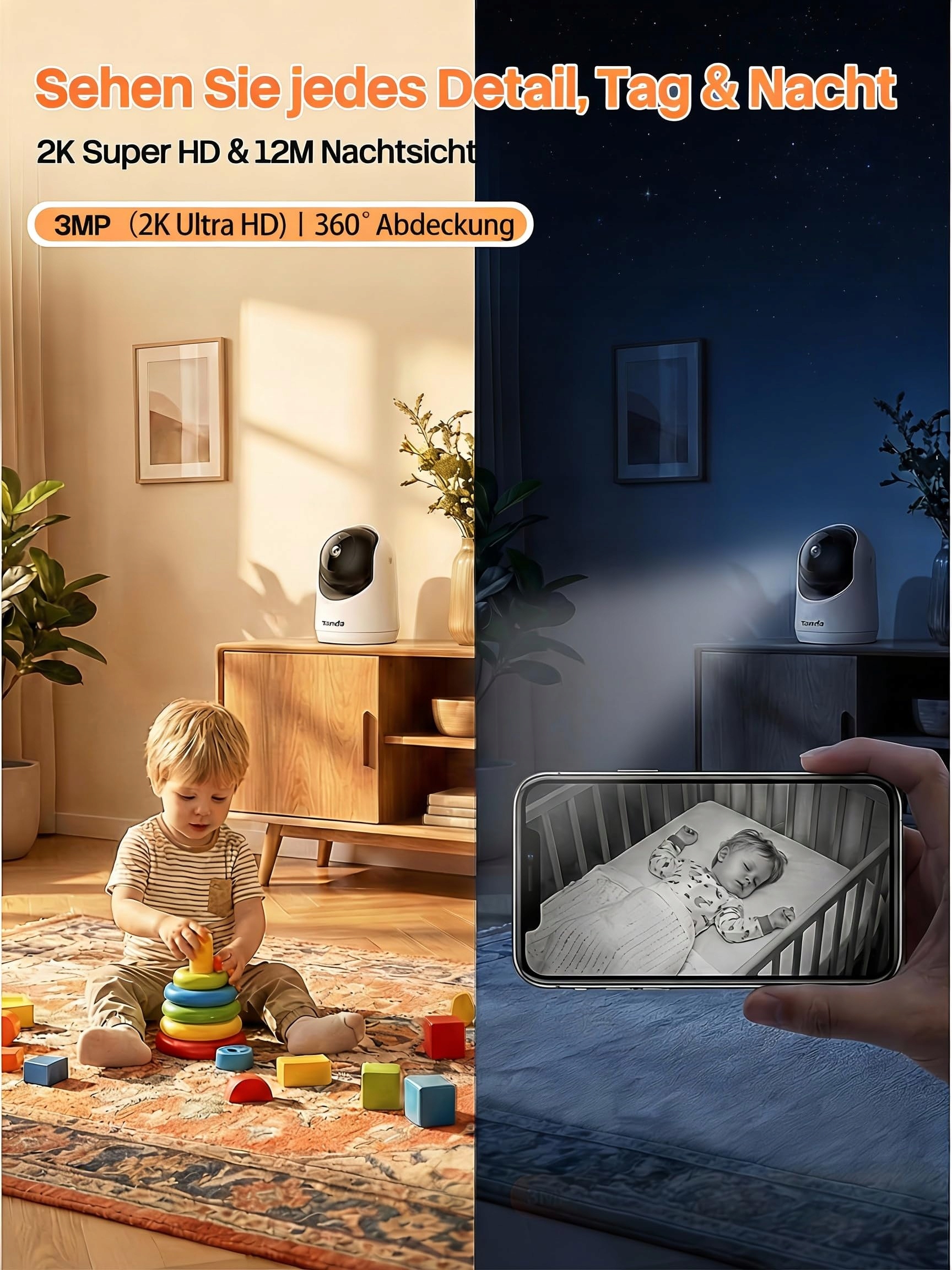 [2K Super HD i widok 360°] Nagrywaj ostre filmy 3MP (2K), które pokazują znacznie więcej szczegółów niż 1080p. Obiektyw obraca się o 360° i nie pozostawia martwych punktów. Dzięki zaawansowanej noktowizji IR do 12 metrów możesz wyraźnie rozpoznać twarze i obiekty nawet w całkowitej ciemności.