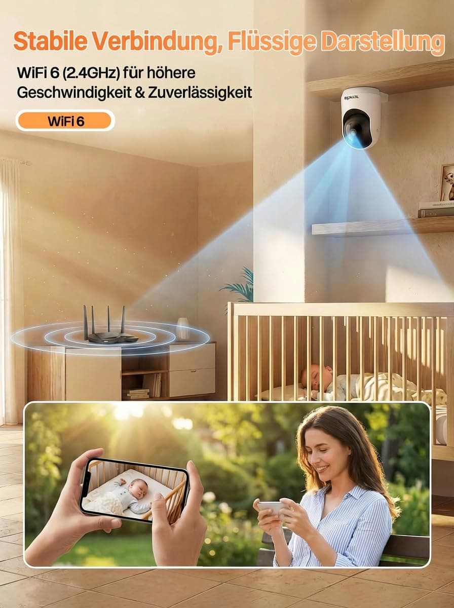 [WiFi 6: stabilne połączenie przez ściany] Dzięki najnowszej technologii WiFi 6 (2,4 GHz) ta kamera lepiej przenika przez ściany niż starsze modele WiFi 4. Ciesz się płynnym strumieniowaniem na żywo bez buforowania, nawet gdy kamera jest zainstalowana daleko od routera – dla niezawodnego monitoringu bez opóźnień.