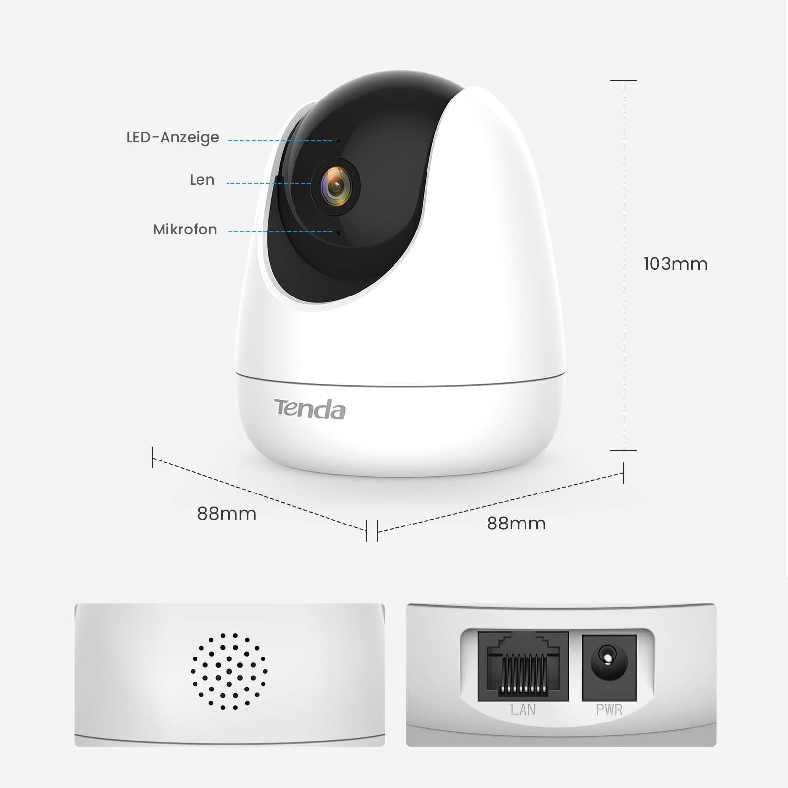 Kamera monitorująca Tenda wewnętrzna 2K, 360 stopni WLAN IP, czujnik ruchu i indywidualny alarm, kamera dla psa/zwierząt/babymonitor z dźwiękiem dwukierunkowym, 12m nocna wizja, kamera LAN/WLAN, CP6