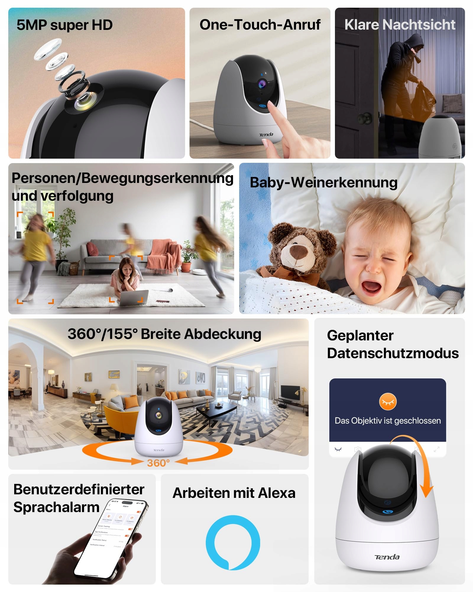 Tenda 5MP Kamera do monitoringu wewnętrznego WLAN, 360° WiFi IP Kamera Indoor, dwukierunkowe audio, noktowizja 12M, AI wykrywanie ruchu i osób, automatyczne śledzenie, dla psa, kompatybilna z Alexą, CP7 V2.0