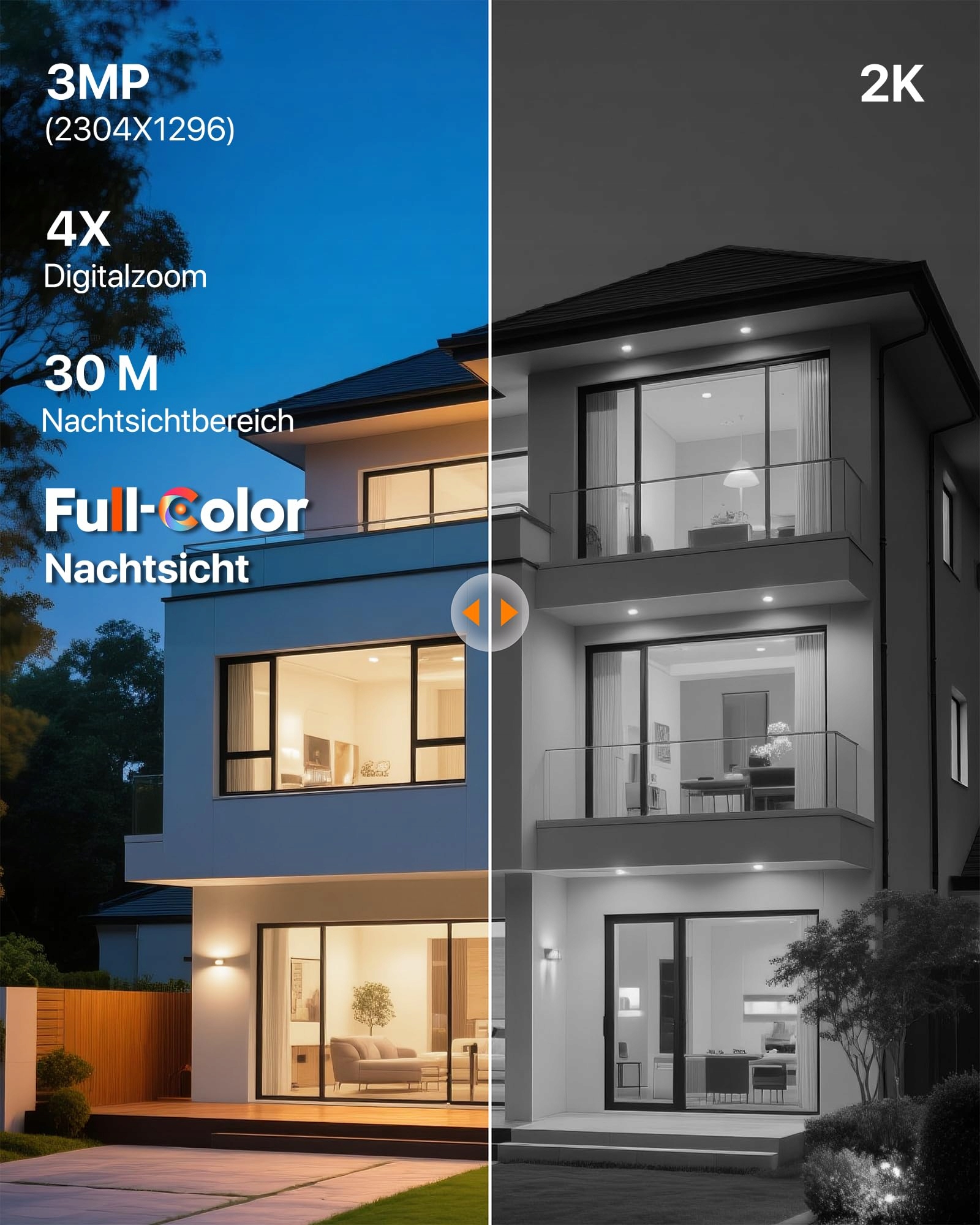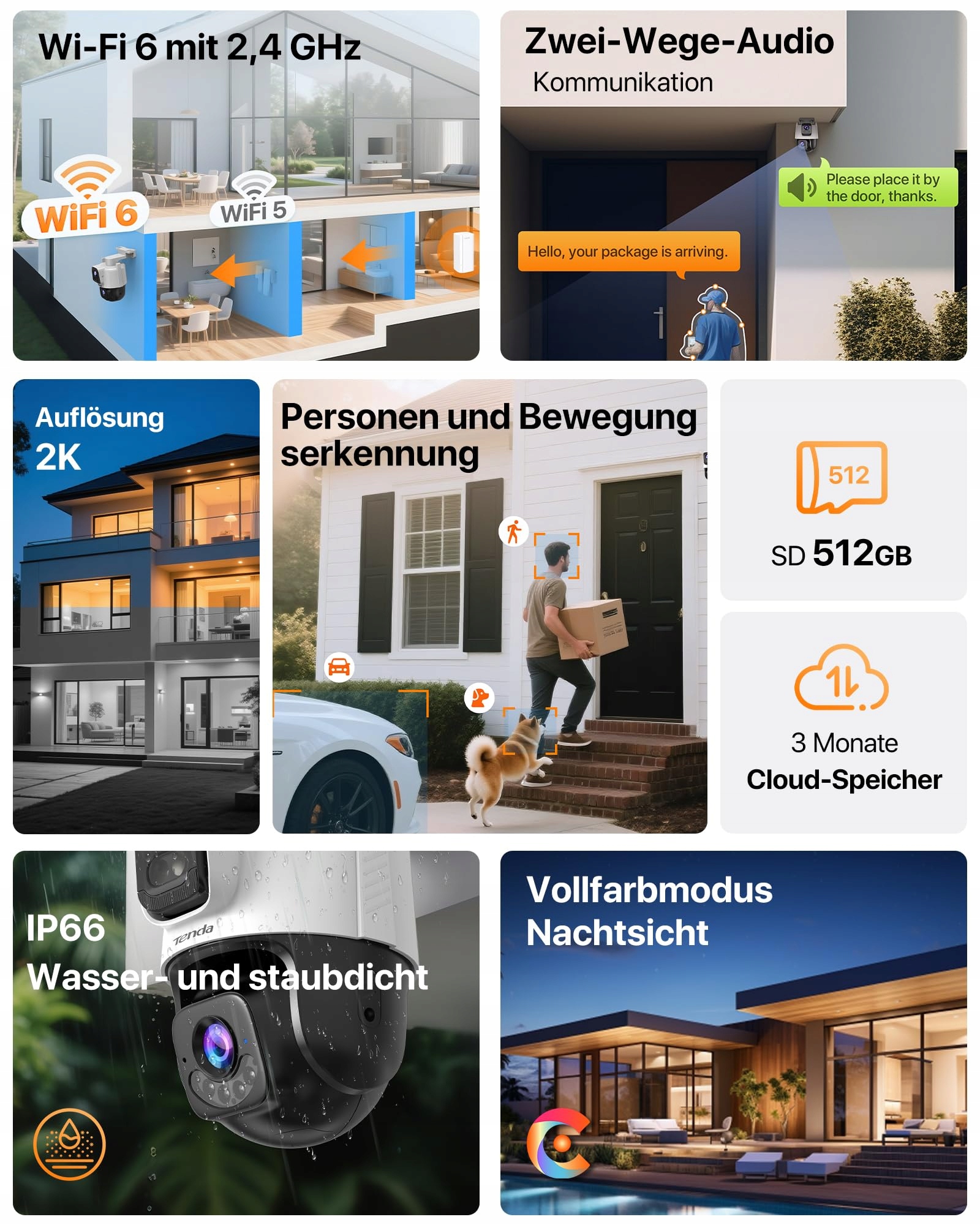 【Wyraźne nocne widzenie w pełnym kolorze】Stała i ulepszona kamera zewnętrzna 3MP dostarcza ostre, wyraźne i wiernie odwzorowane obrazy w rozdzielczości 2K. Podwójna kamera do monitoringu zewnętrznego obsługuje nocne widzenie w pełnym kolorze na odległość do 30 m i może rejestrować szczegóły również w nocy. Wbudowana antena wzmacniająca sygnał, obsługa połączeń przewodowych i bezprzewodowych oraz Wi-Fi 6 (obsługuje tylko połączenie Wi-Fi 2,4 GHz), wideo i sterowanie działają płynniej