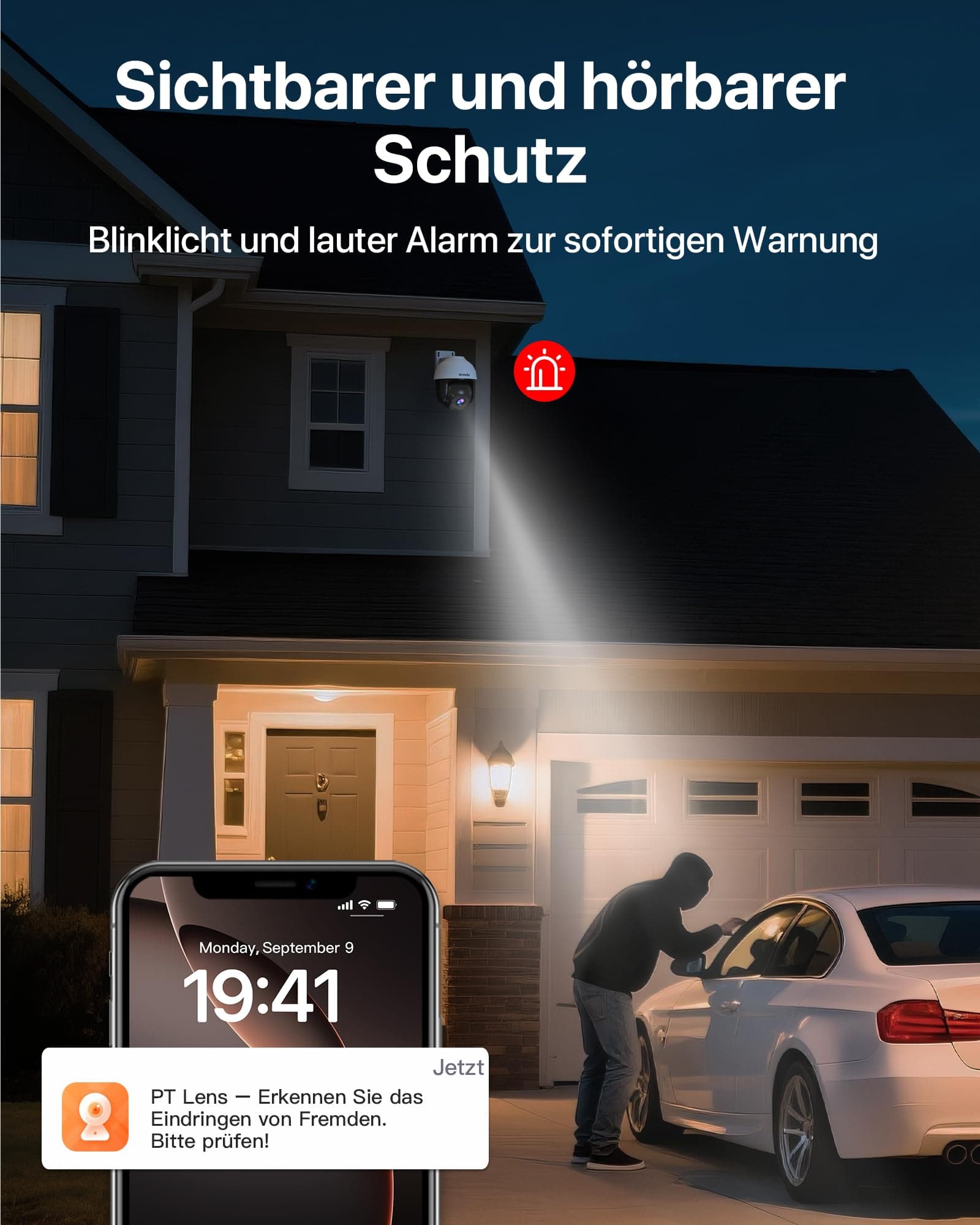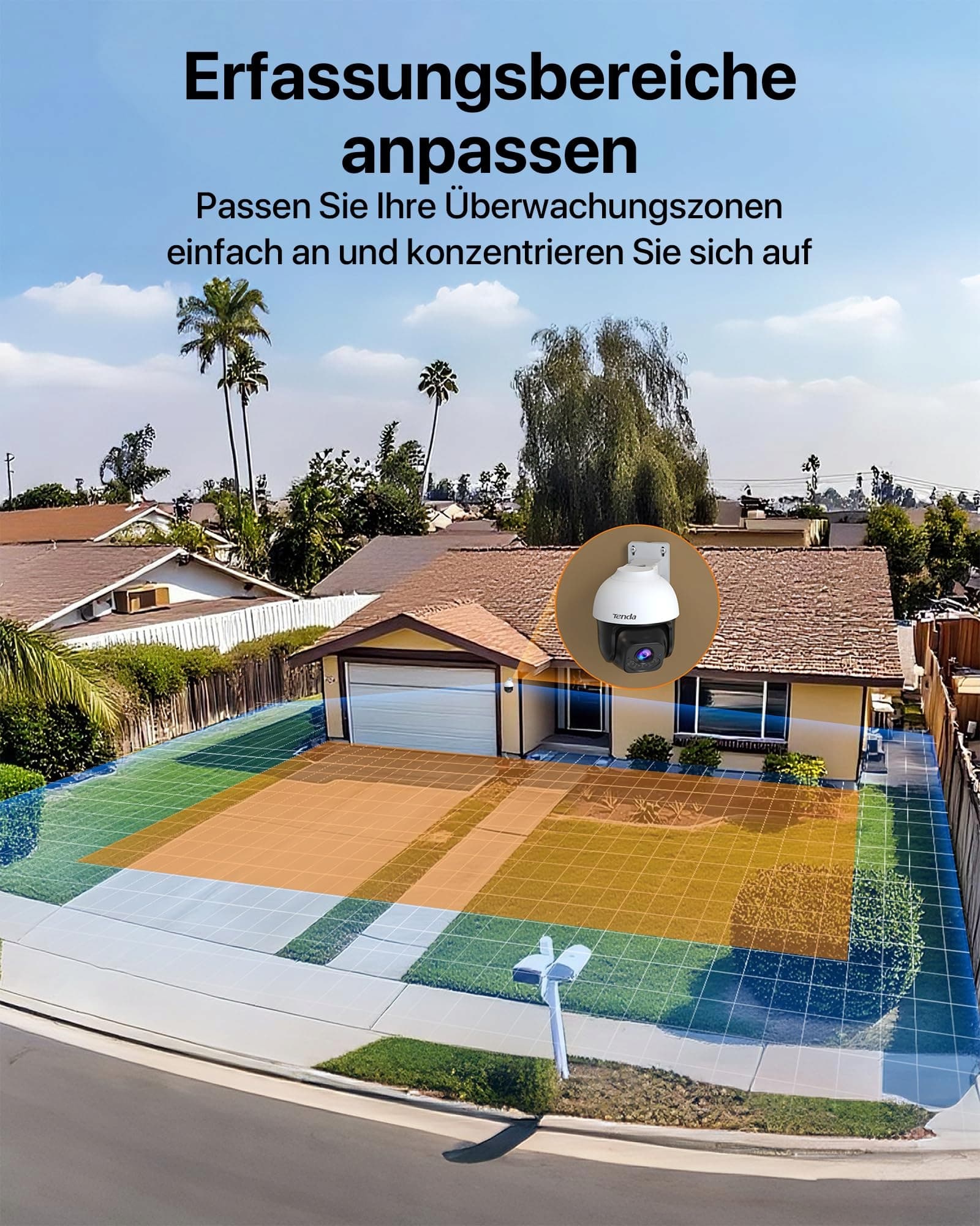 [Wykrywanie przekroczenia granicy] Za pomocą oficjalnej aplikacji TDSEE dla tej kamery Wi-Fi możesz indywidualnie dostosować obszar monitoringu. Aplikacja natychmiast powiadomi Cię, gdy osoba lub pojazd wejdzie na ten obszar. Obsługuje również ustawianie punktów monitoringu, dzięki czemu kamera zewnętrzna po zeskanowaniu całej posesji automatycznie wraca do ważnych miejsc, aby monitorować je w czasie rzeczywistym.