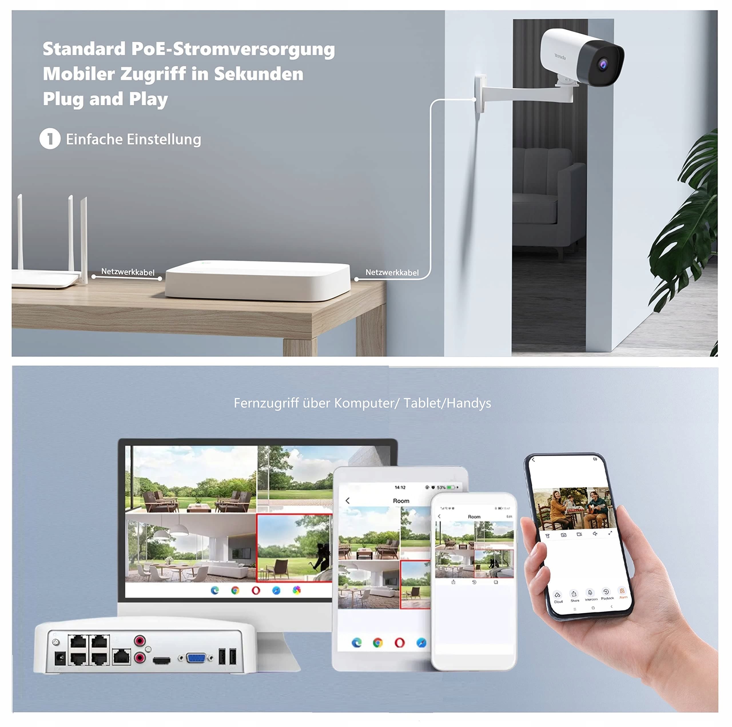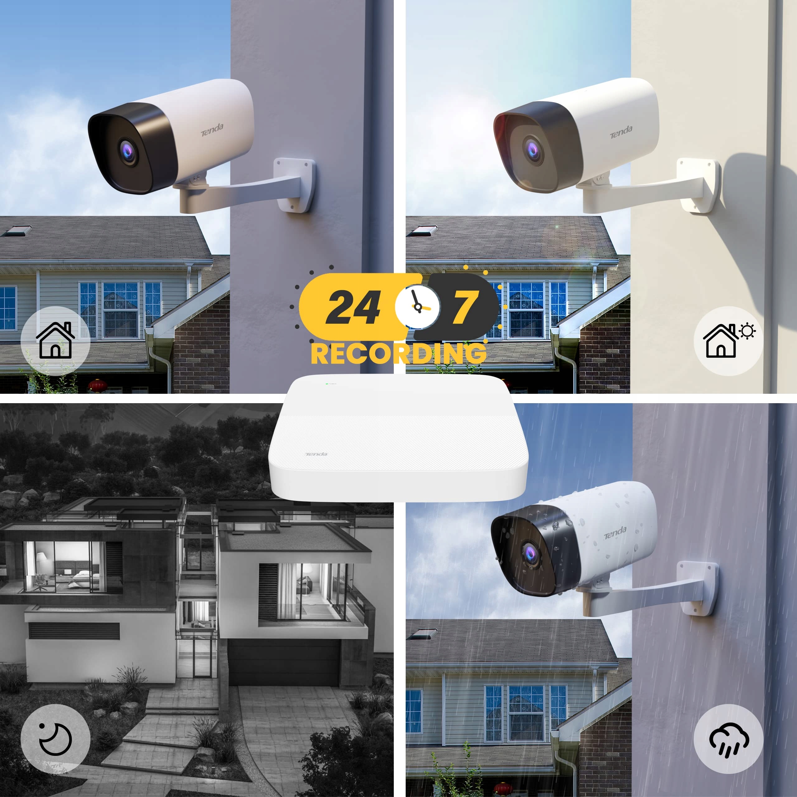 Zestaw kamer monitoringu Tenda PoE na zewnątrz, 8X 4MP kamera CCTV na zewnątrz + 1TB HDD + NVR (obsługuje do 10TB) do całodobowego monitoringu wideo, kamera PoE IP z AI wykrywaniem osób, widzenie nocne, K8P-4TR-1T