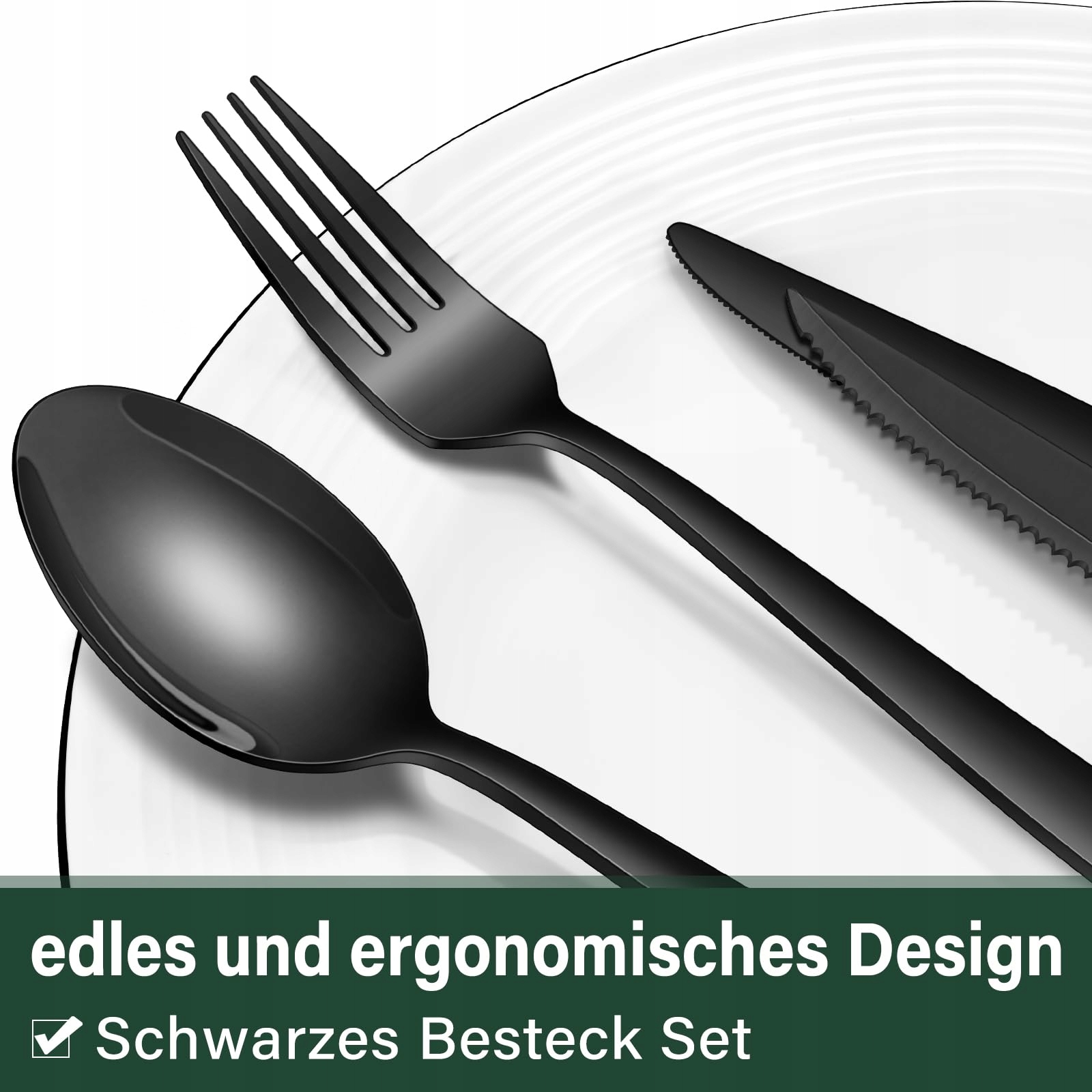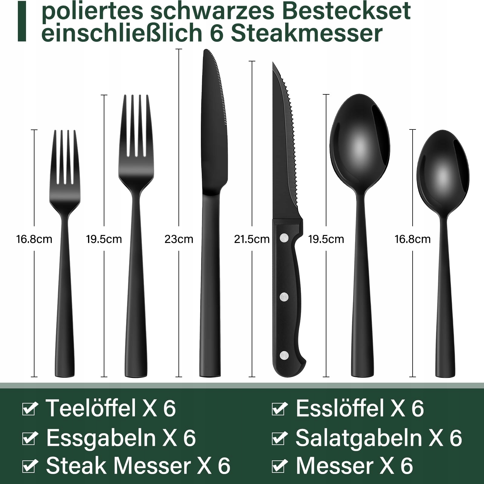 Terlulu 36-częściowy zestaw sztućców ze stali nierdzewnej z nożami do steków czarny, zestaw sztućców dla 6 osób, elegancki zestaw sztućców z nożem, widelcem, łyżką, sztućce stołowe do domu/na imprezę/restaurację, nadaje się do mycia w zmywarce