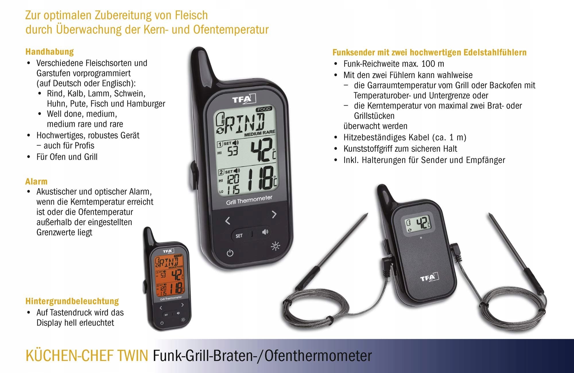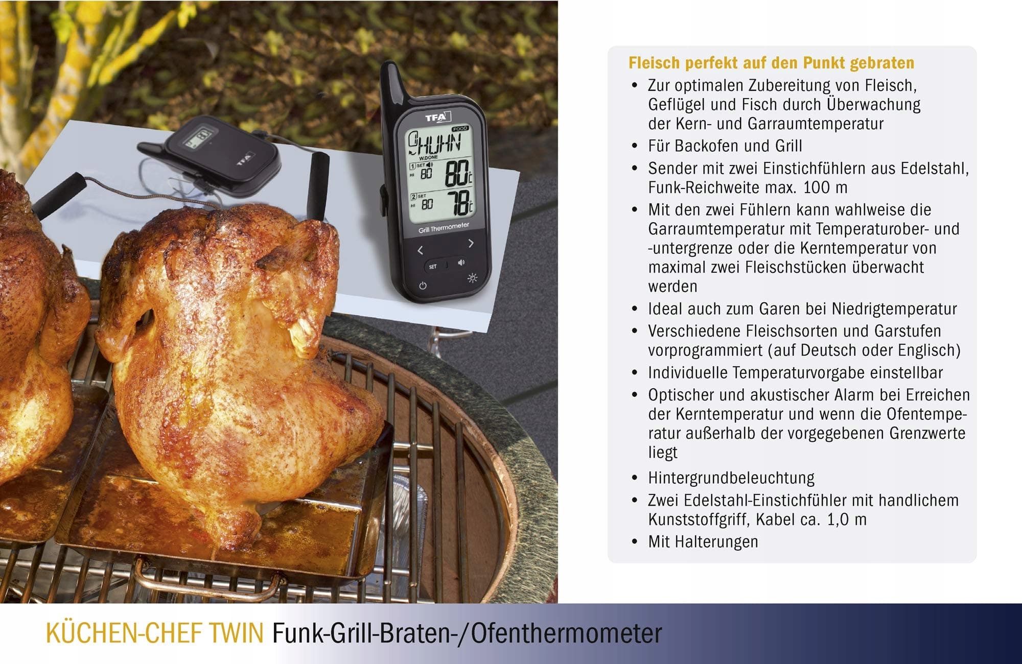 TFA Dostmann Cyfrowy termometr do grilla bezprzewodowy TWIN, 14.1511, termometr do mięsa, szef kuchni, akcesoria do grilla z dwoma sondami, zaprogramowane rodzaje mięsa, temperatura pieczenia/rdzenia, BBQ, alarm