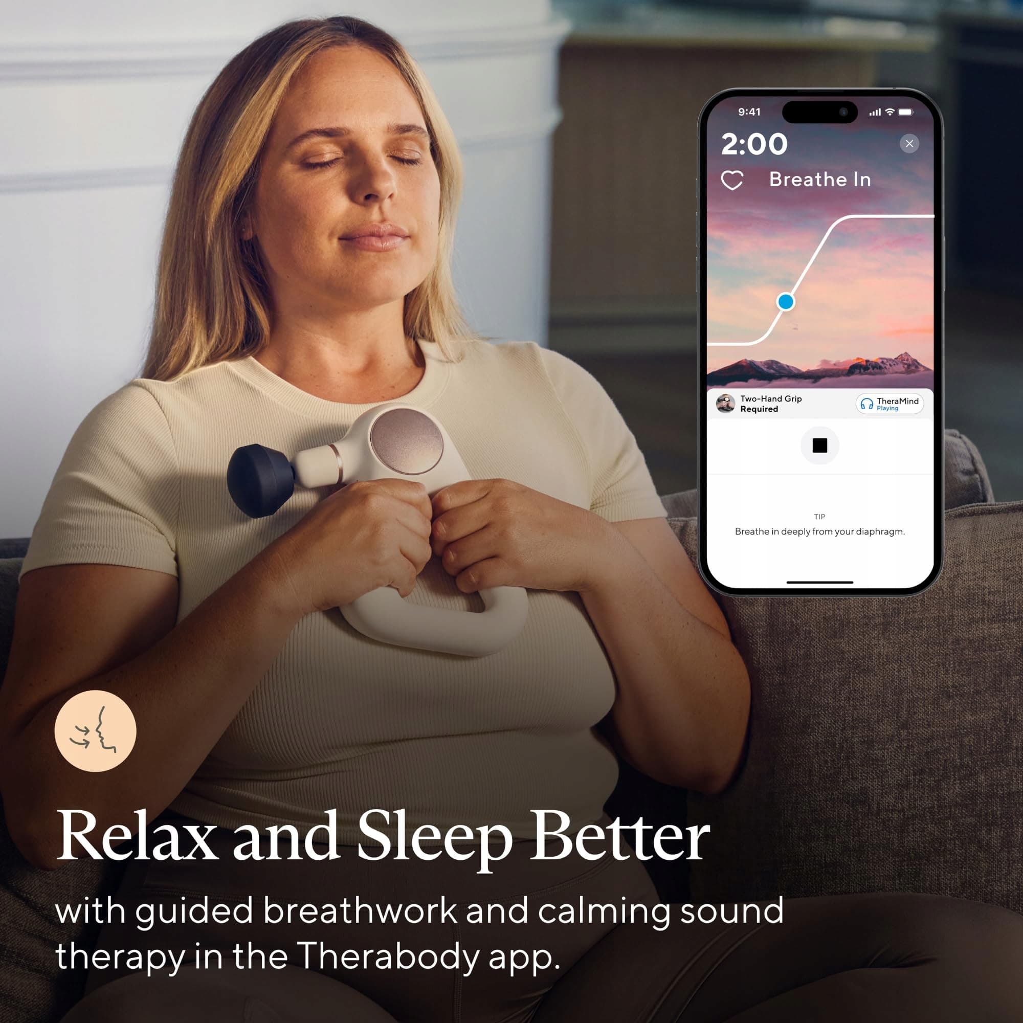 Uważność ułatwiona dzięki kojącym ćwiczeniom oddechowym: prowadzone ćwiczenia oddechowe dobrze współpracują z terapią dźwiękową TheraMind i relaksującymi wizualizacjami w aplikacji Therabody, aby zapewnić immersyjne doświadczenie relaksacyjne - z czujnikiem biometrycznym na urządzeniu do spersonalizowanych pomiarów tętna.